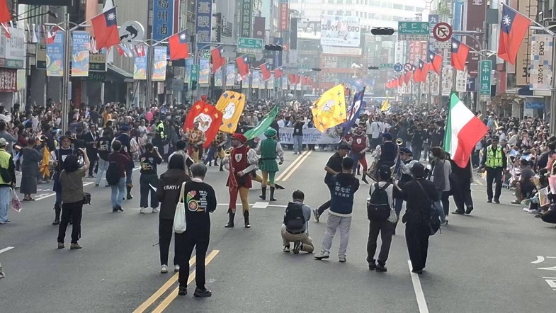 管樂踩街開幕演出【百年樂聲,共響嘉年】磅礡震撼,立即成為全場矚目的文化亮點。北港朝天宮哨角團以傳承近300年的古老哨角聲率先響起,低沉厚實的號角聲象徵祈福與啟程,亦帶出嘉義與臺灣在地文化的歷史紋理;嘉義城隍廟陣頭,鼓陣節奏如心跳般推進,穩健的步伐與儀式動作展現數百年來守護嘉義的特有文化力量;來自義大利的科里羅尼中古世紀管樂旗隊則以鮮麗旗舞與號角旋律加入,讓歐洲中古世紀城鎮慶典的華麗風貌在嘉義街頭重現。三方文化首度同臺,哨角、鼓聲與旗舞交織成跨越時代與國界的精彩畫面,展現嘉義市作為國際管樂之都的文化深度與包容能量。