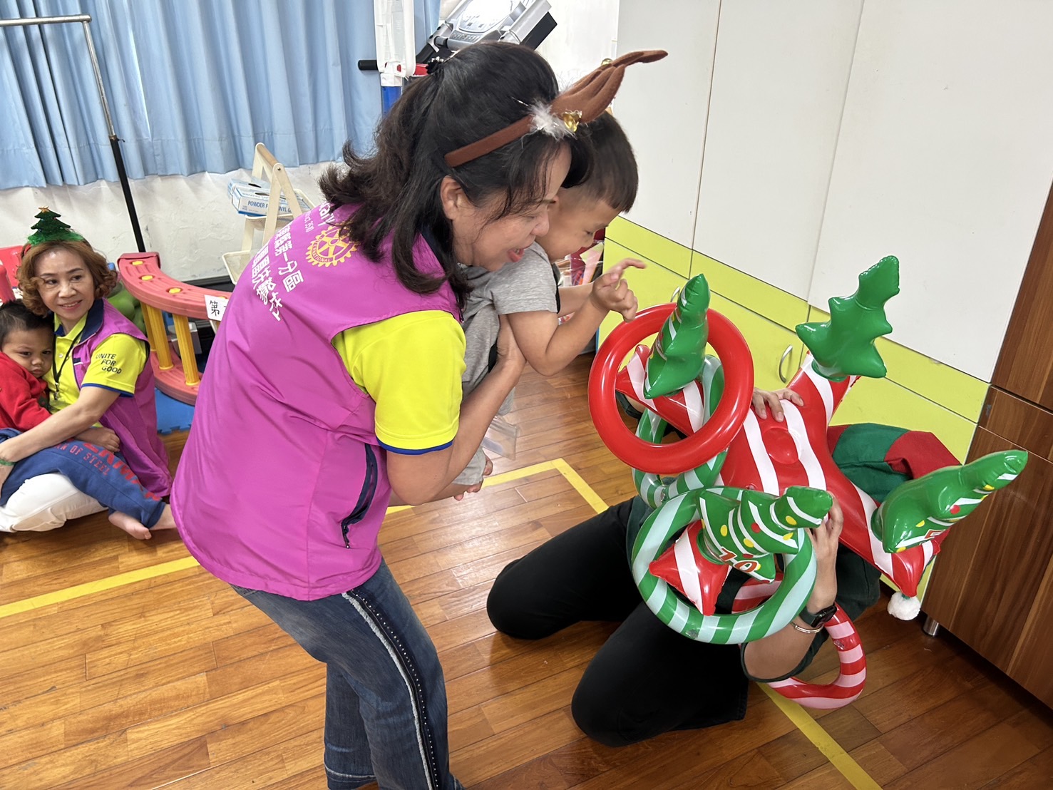 在這場活動中,教保員和企業志工擔任關主,戴上充氣鹿角,幼童將6個圈圈套在關主的鹿角上,可訓練幼童們的手部精細動作,活動中笑聲不斷,為慢飛天使帶來溫暖陪伴。