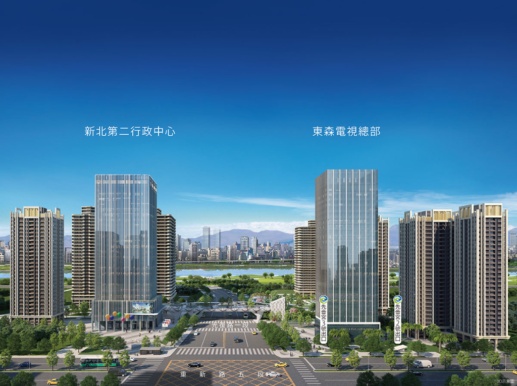 新北第二行政中心與東森電視總部設於捷運先嗇宮站周遭,將帶來大量的人口紅利(3D透視圖)。 圖:甲山林建設