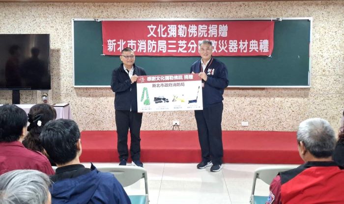 【民眾新聞葉柏成新北報導】文化彌勒佛院今〈22〉日捐贈新北市消防局多項車禍救助相關器材,協助第三救災救護大隊三芝分隊提升救援效能。由消防局張易鴻主任秘書出席受贈典禮,並代表全體同仁表達誠摯感謝。