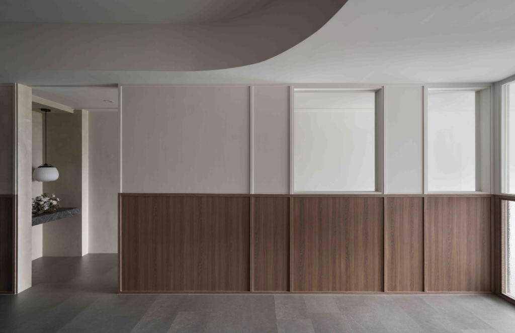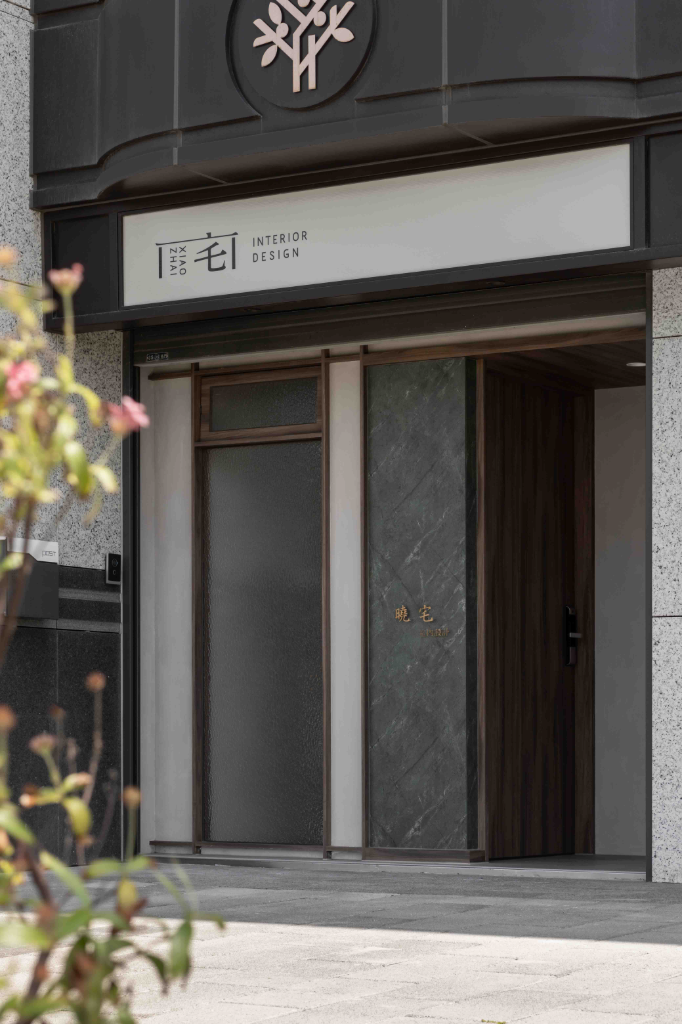 考量室內格局狹長且擁擠,於是設計師在建案中創造2種轉折變化,使場域形成錯落有致的多層次構圖。第一種轉折用於戶外,透過90度內轉玄關,重新詮釋立面秩序,並將門面退縮至轉角,順勢消弭入口原有柱體的壓迫感;第二種轉折位於入門後的動線,設計師透過巧妙調整使迎賓區與端景相互對話,引導來訪者在無壓力情況下適當地停留。
