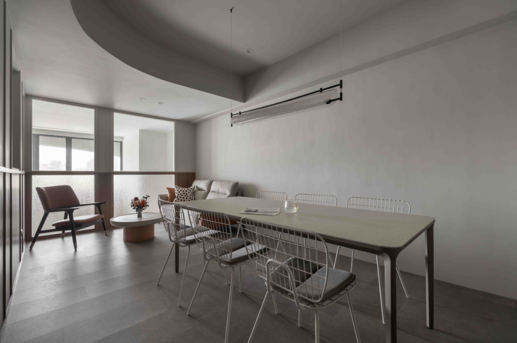 此外,材質與色彩亦同樣展現放大全室空間的延伸感,設計師針對整體牆面選擇淺色特殊塗料,展現啞光質地與手作紋理效果,而用料方面則捨棄大理石或實木等資源密集型材料,改用系統板替代,大幅減少環境負擔。