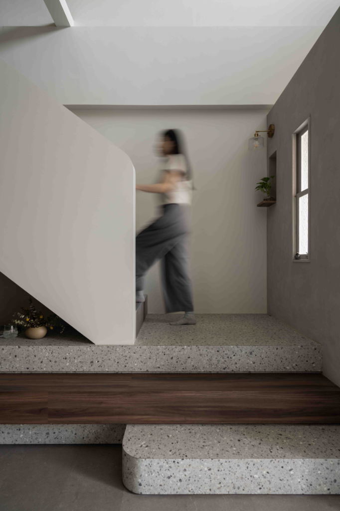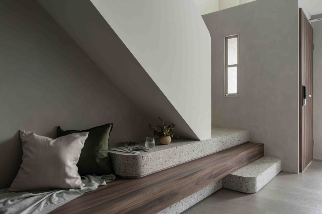 另一方面,入口主視覺的部份,設計師選擇義大利麂皮漆作為門面主色調,再點綴綠碧璽石紋成為門面焦點,穩重中帶有自然礦物紋理感,而室內樓梯的前三階組成材質為木紋與水磨石,搭配隱藏燈光與弧形扶手,進一步延續立面語彙。