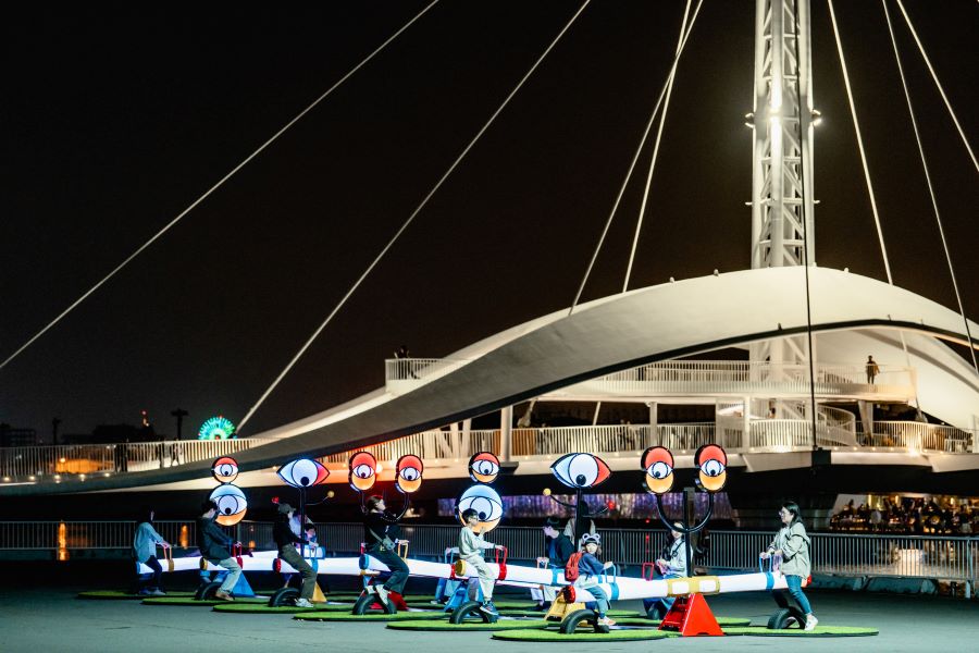 《好奇翹翹板》共有六座互動式翹翹板,裝置主體的巨型眼睛會在民眾進行體驗遊玩時,隨著翹翹板升降而轉動,彷彿正好奇地注視。而翹翹板升降時會發出獨特音效,乘坐者在一上一下的頻率中找到彼此的節奏,一起完成這場聲光互動。藝術團隊Amigo &