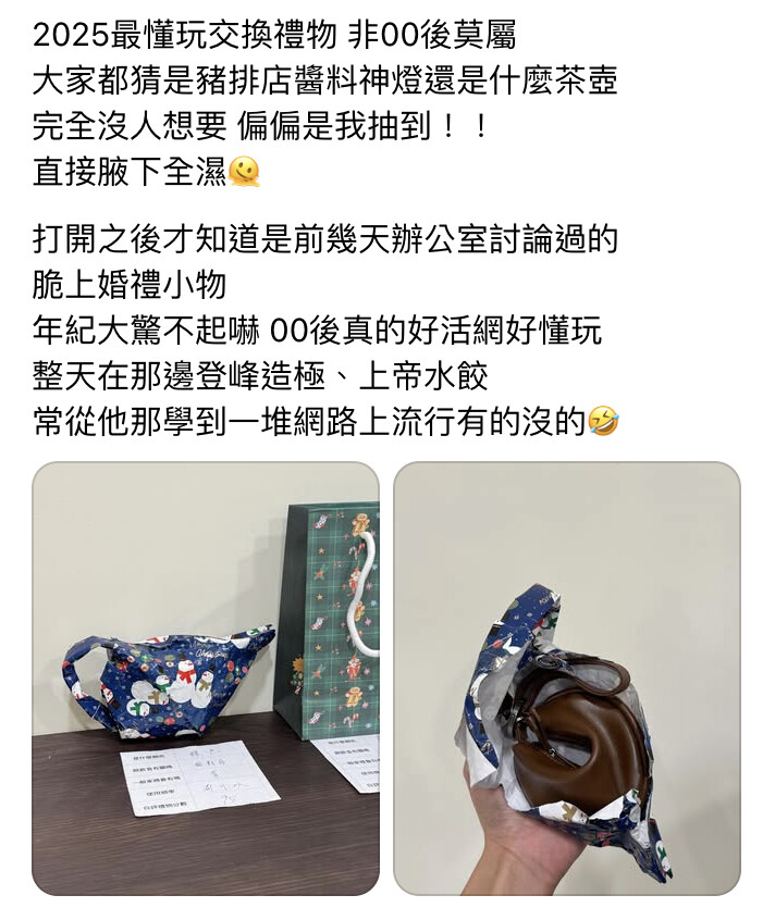 無獨有偶,相關討論並未止於婚禮情境,也有另一篇相同幸運餅乾零錢包的分享貼文在社群平台快速竄紅。該名網友於貼文中分享自己在年末交換禮物場合抽到同款幸運餅乾包,根據包裝外型原本猜測可能是「神燈」或「醬料杯」,打開後才驚喜發現竟是近期討論熱烈的包款,並提到送禮者靈感來自「前幾天才剛看過新娘捧花那篇」,讓兩則貼文在社群間形成串聯效應。該篇貼文上線短短一天即吸引約14萬次瀏覽、累積超過3,000讚,不少網友也在留言中直呼「禮物就是要包的讓人猜不懂」、「我今年也送這個欸!前幾天看到人家分享立刻殺去買」,使幸運餅乾包從婚禮祝福延伸至節慶送禮情境,再度引發關注。產品資訊: https://lihi.cc/bYb1X