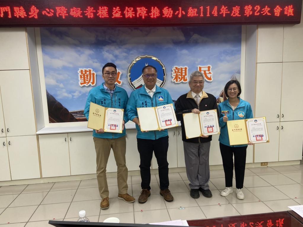 本次會議除頒發新任委員聘書,同時頒發113年10月1日至114年9月30日採購庇護工場產品評比優勝機關,第1名為金門縣公共車船管理處、第2名金門縣金寧鄉公所、第3名金門酒廠實業公司。