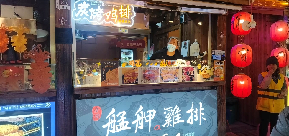 雖然現在是冬季,夜晚漸漸清涼,但是昆明人的夜生活、夜經濟,一慣繁華熱鬧,昆明台北街上聚集不少食客,一排排、一攤攤售賣台灣特色小吃的攤位飄出陣陣香味,大腸包小腸、鹹酥雞、旗魚黑輪、愛玉冰等美食琳琅滿目。