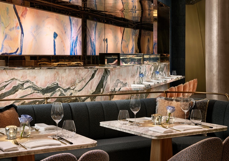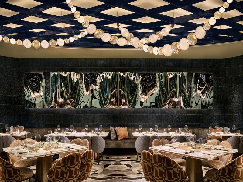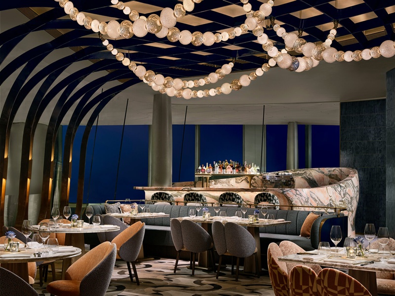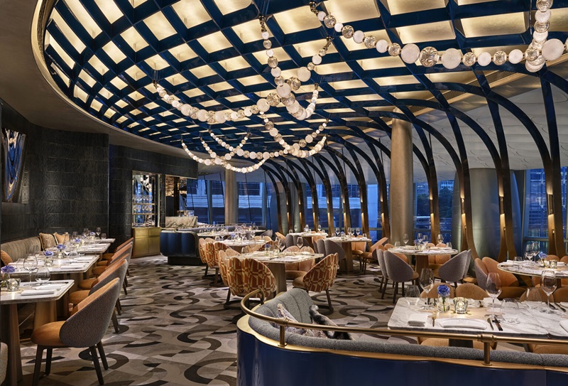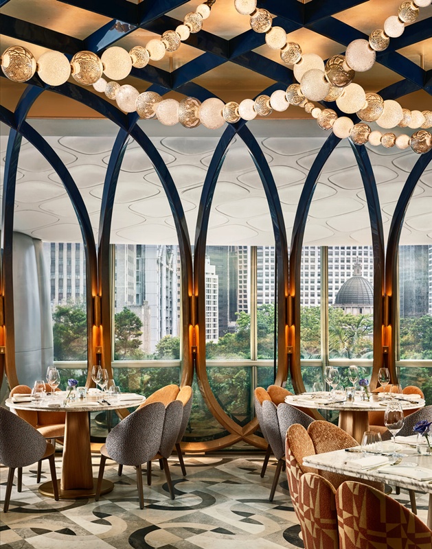 置身其間,主用餐區成為空間的視覺核心。流暢線條和雕塑化結構交匯成韻,恰如交響樂曲進入第三篇章,節奏由柔緩推進至明快。天花板鍍金圍欄透過柔和姿態延展,與 The Henderson 外牆的有機線條相互映襯,使內外景致自然銜接。雲石拼花地坪流露靈動光澤,落地玻璃窗引入柔潤天光與城市剪影,金色細節熠熠生輝,猶如陽光掠過水面,泛起粼粼波光。