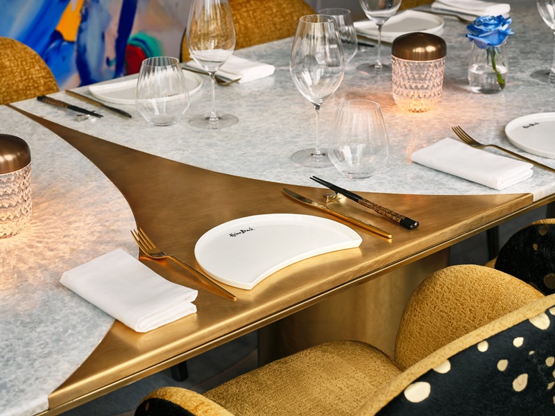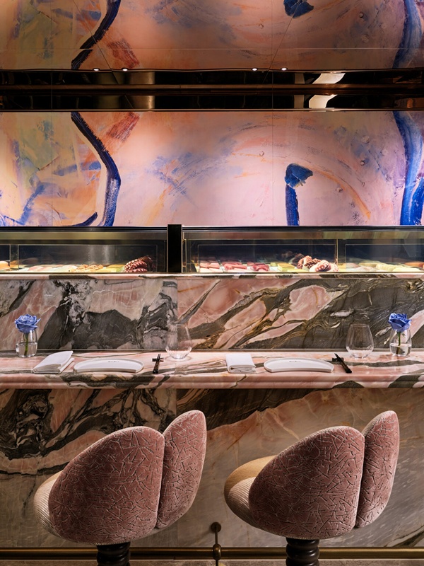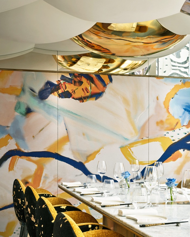 特色壽司吧以親切姿態迎賓,訪客可近距離欣賞廚師精妙的手藝,感受料理在刀鋒與心意間流轉的溫度。設計結合Akira Back 主廚母親 Young Hee Back 的畫作,為場域增添一縷溫情與藝術氣息。此外,色彩鋪陳以紅緋、群青與櫻色為調,金色高光綻放其間,構築靜謐而柔美的色彩協奏。座椅與沙發融入金黃稻麥意境,和紙的細膩紋理營造日式美學的和雅氣韻。團隊運用現代語彙詮釋傳統精神,致敬主廚 Akira Back 的文化背景,於傳承與創新之間奏出恬然而和諧的曲調。