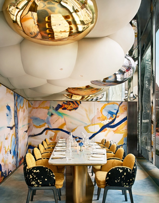 不僅如此,追求專屬體驗的賓客,亦可在私人包廂展開最終樂章的饗宴。空間飾以 Young Hee Back 的塗鴉創作,鮮明筆觸為餐廳注入蓬勃生機。天花板採棉花糖造型綿延,拋光黃銅在柔光中泛起光澤,凝聚俏麗亮點。足下的泡泡紋地毯則為空間添上一抹輕巧,使氣氛於靜謐中譜出歡快韻律。視線依循中環主幹道的紅棉路遞進,將包廂的絢麗輪廓與奪目光彩一覽無遺,恰如一封引人入勝的視覺邀請函,映照出餐廳大膽前衛的設計語境,引領訪客步入別有洞天的感官藝境。