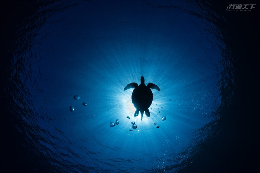 ▲ 當海龜上升至水面呼吸的逆光剪影,與在水下的我呼吸吐出的泡泡,組合成很美的畫面。