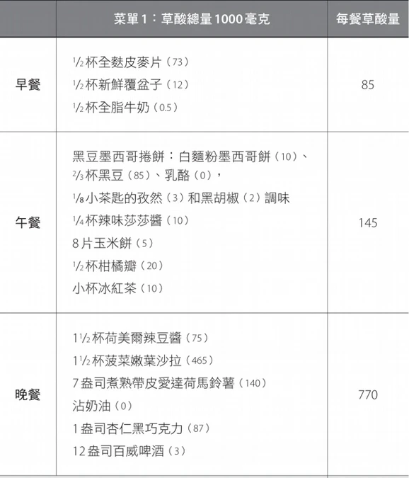 對於身體健康的人來說,每天把草酸攝取量控制在200毫克以下(每餐約60毫克),大致就能避免草酸帶來的潛在危害。這樣的飲食原則,不僅有助於腎臟功能稍弱的人恢復健康,對於已經出現草酸相關不適的人,也能逐步減輕症狀。