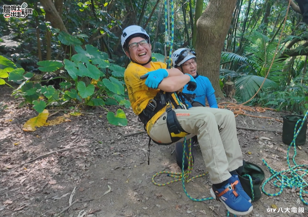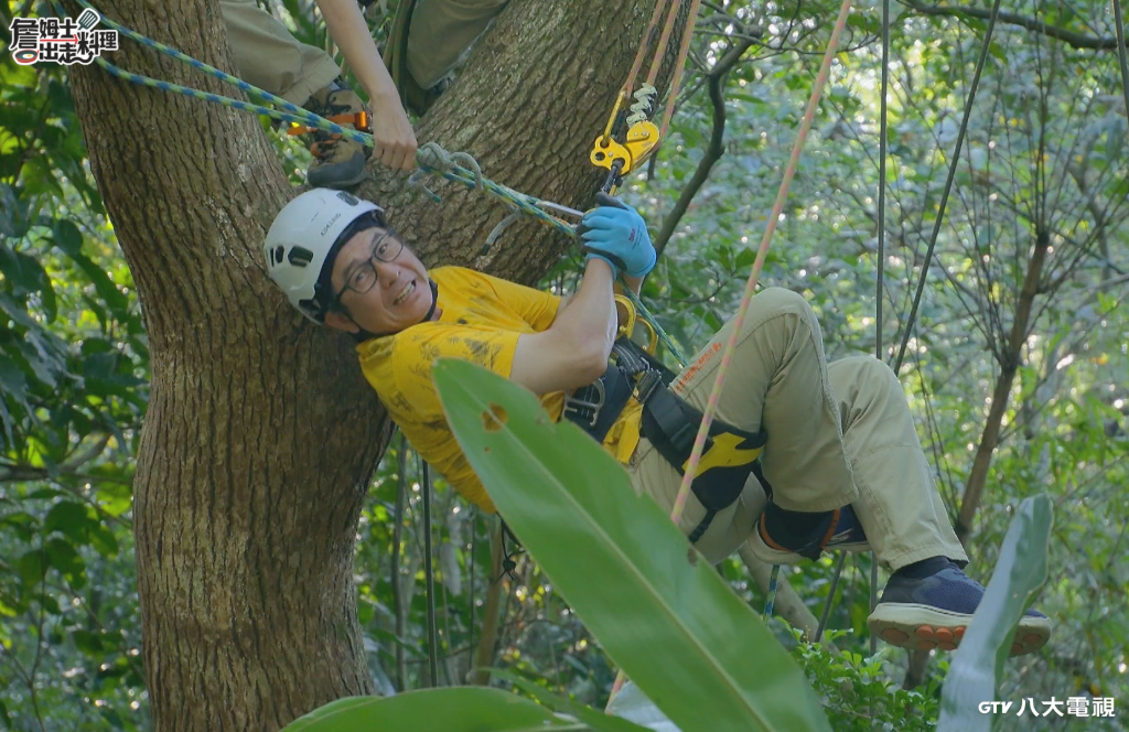 ▲ 詹姆士在專業攀樹師的指導下鋸樹。(圖:八大)