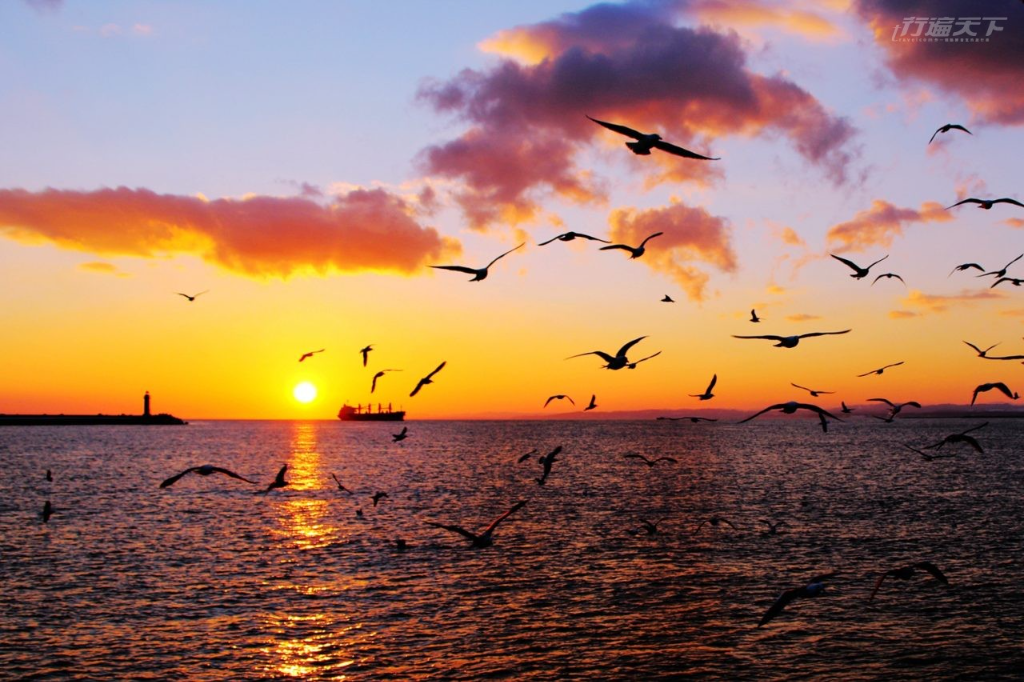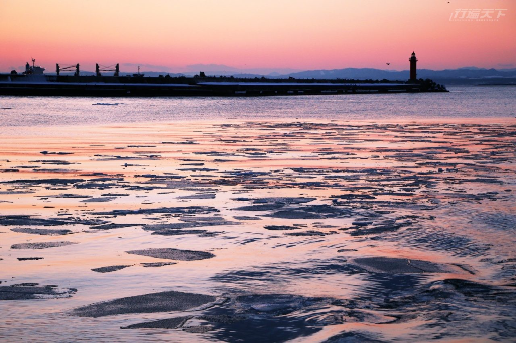 ▲ 冬季港口的海上飄著薄冰,在夕陽餘暉下泛著魔幻的波光,甚是迷人。