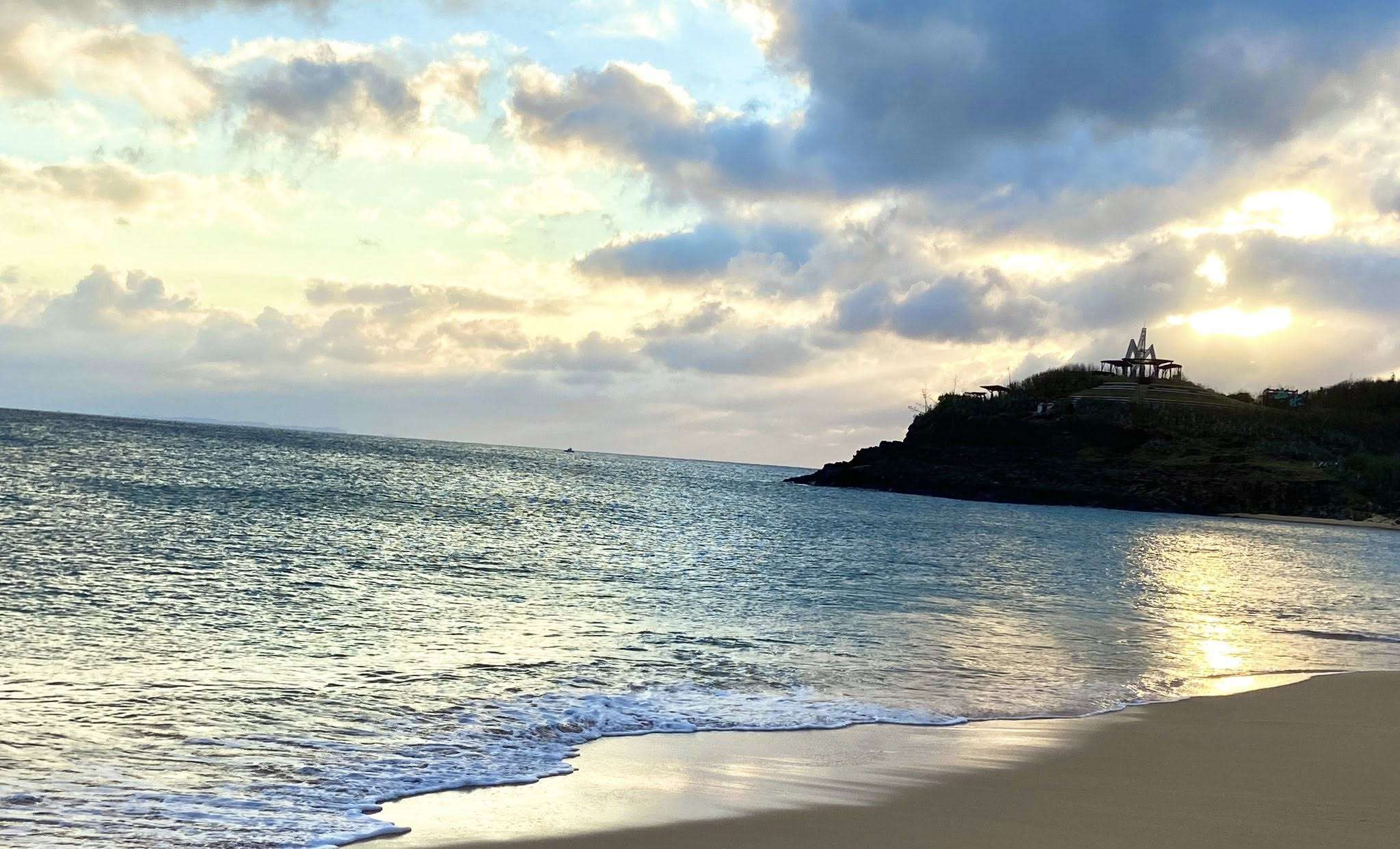 山水沙灘,景如其名,沙白而細膩地涵詠珊瑚、貝殼碎末。海浪如薄紗,一波波自耀眼的鋅藍 、潺潺的水藍、亮麗的靛藍,投來透明的思念。