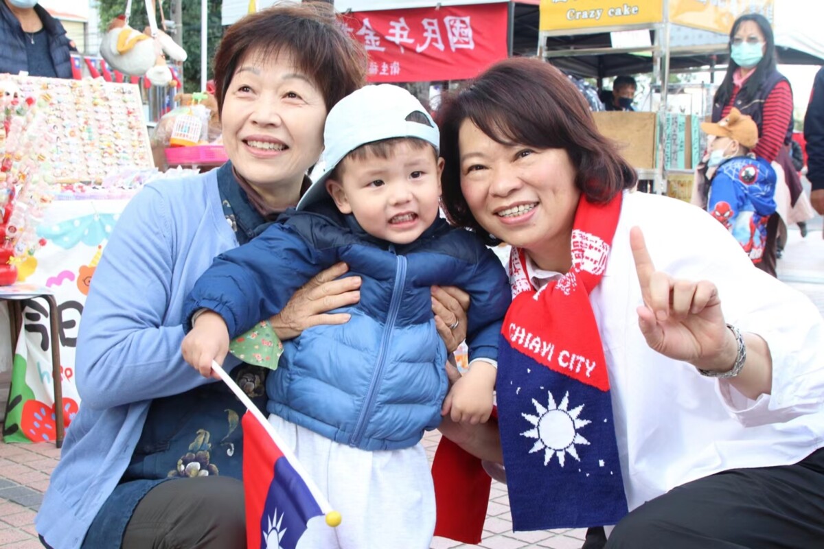 圖:嘉義市長黃敏惠今早參加經國、精忠新城元旦升旗 ,並陪伴佛光寶寶迎新年。(記者吳瑞興翻攝)