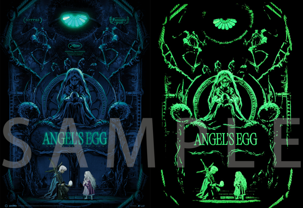 ▲ 《天使之卵》美版原文A3夜光海報(左圖)關燈後散發幽幽綠色夜光(右圖),將作品獨有的神秘與詭譎氛圍推向極致。(圖:甲上娛樂)