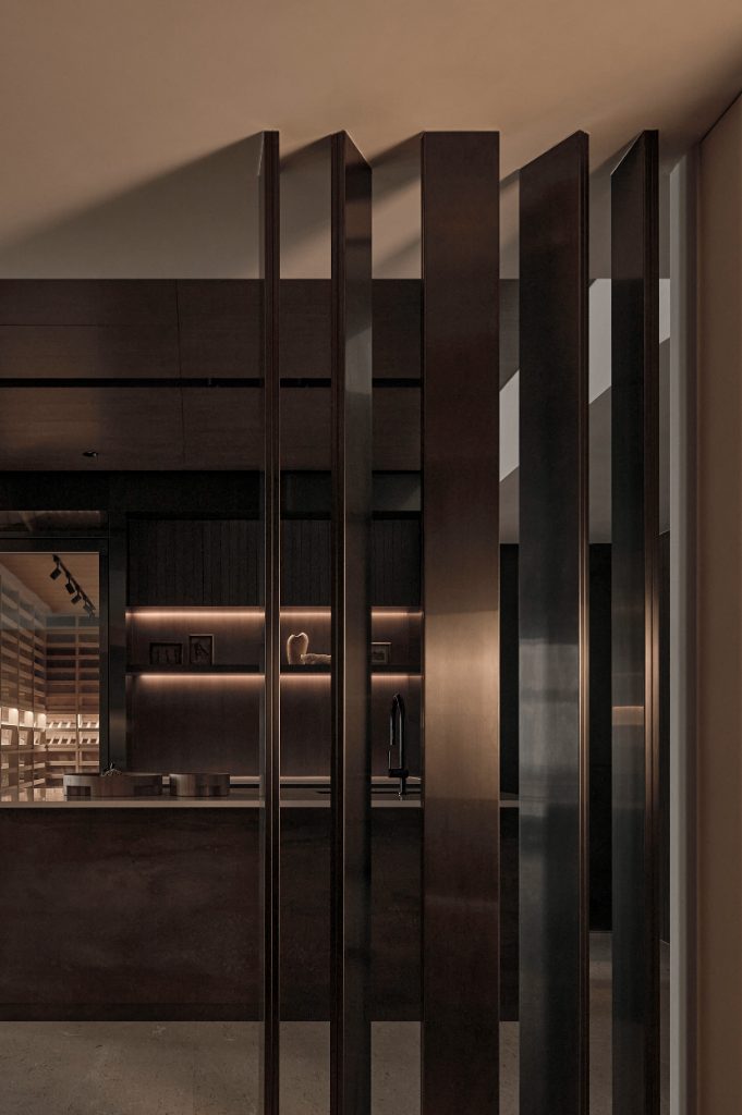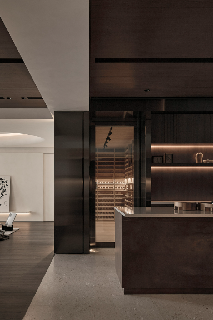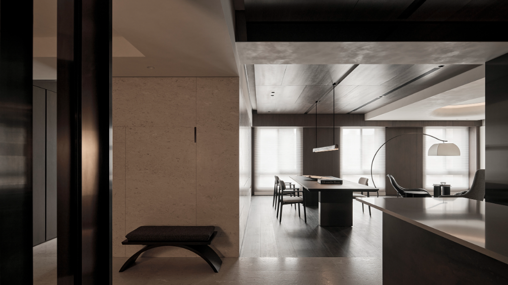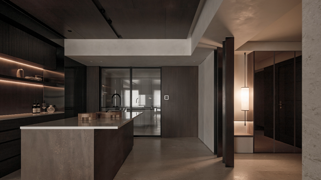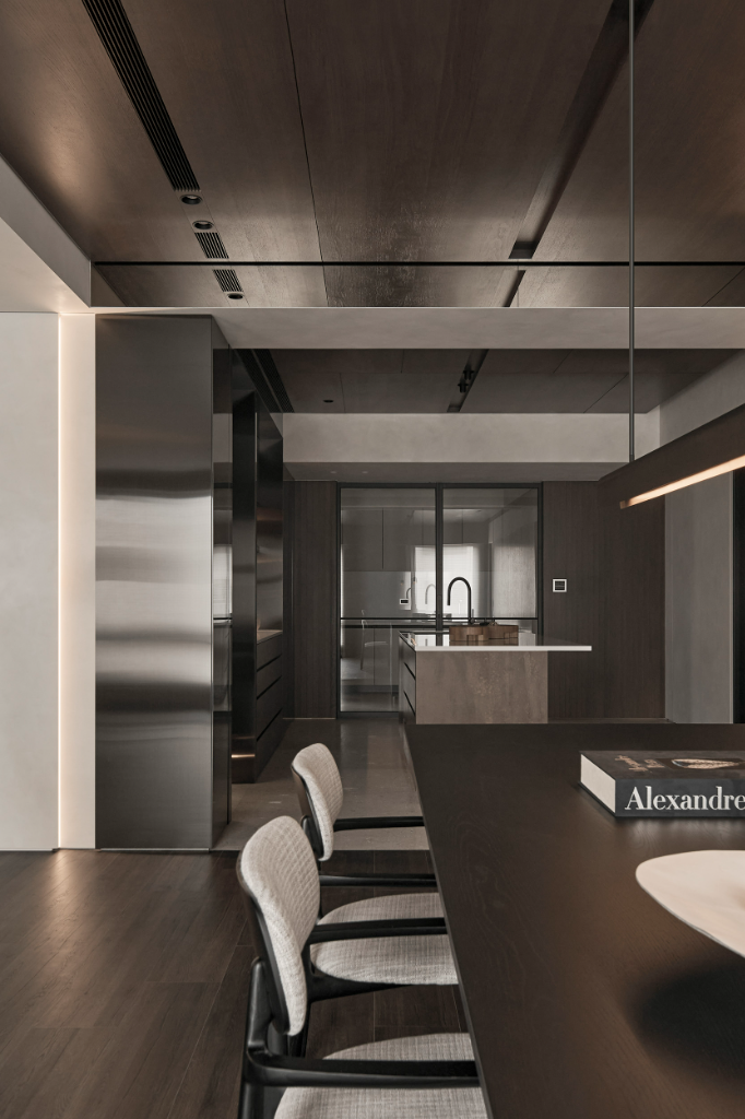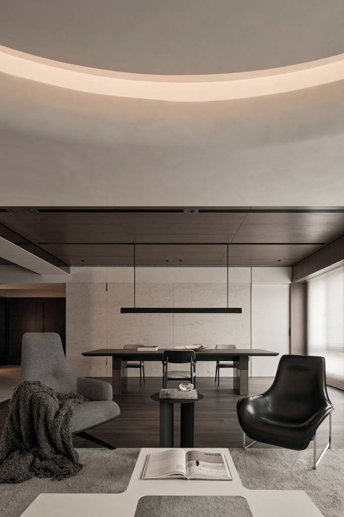 同時設計師在慎重思考客廳與餐廳的關係後,協調兩者間的配置使其能以更流暢的模式相互串聯。透過拉長中廚與客廳的垂直軸線,視覺被自然引向屋內深處,形成穩定而豐富的視域。這樣的設計除了令空間倍顯開闊,完善實用機能,也令家庭成員彼此的日常情感交流更加自由、也更為自然。