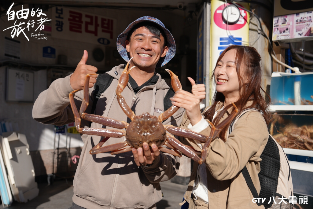 兩人也前往熱鬧的機張市場,看到熟悉的柿子水果攤,融融好奇詢問大家喜好「軟」柿還是「硬」柿?沒想到包括融融和工作人員一面倒選硬的脆口,身為在地人的咪蕾和水果攤老闆則愛軟Q口感,意外發現同樣水果,台韓的偏好也大不同。此外,市場中絕不能錯過的松葉蟹,由於價格隨季節浮動,外景拍攝時剛好遇上高價期間,一隻重約1公斤的松葉蟹,台幣近2千元,融融當下自掏腰包大方請客;料理後的蟹肉肥美鮮甜,融融、咪蕾大啖美食,直呼太幸福。