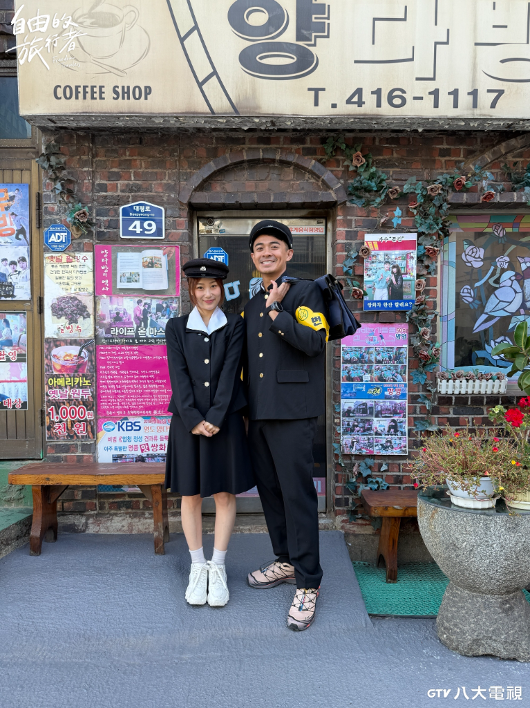 八大綜合台自製實境旅遊節目《自由的旅行者》第二季,這次由搭檔咪蕾帶路,和主持人融融造訪多部韓劇取景的60年代復古茶房,店內充滿懷舊風格的傢俱和擺設,為了融入環境氛圍,融融和咪蕾特地換上韓國早年的學生制服並拍照留念,咪蕾大笑說,很像父母親那個年代會穿的制服,融融則被虧看起來像「學長」,但也讓他直呼,兩人這身打扮造型像走入韓劇裡。