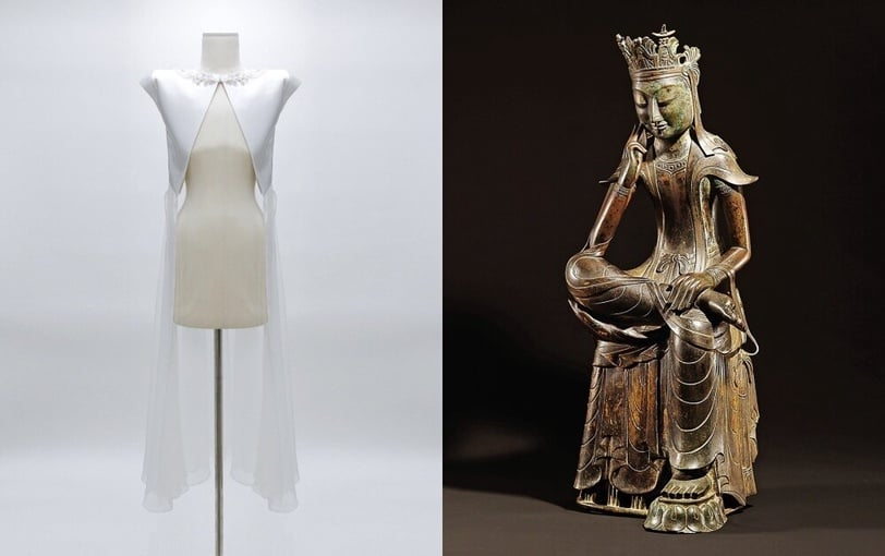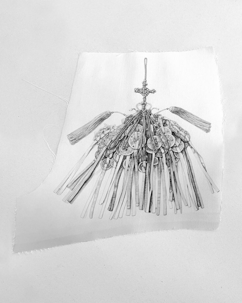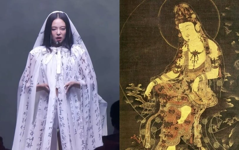 這次 LEJE 也在 Jennie 的舞台服中大量加入「透明薄紗」元素。靈感來自詩人趙芝薰〈僧舞〉中那句著名的「輕薄的紗、雪白的頭巾,我小心折起,飄然起舞」,象徵一種只有韓國人才能體會的細膩美感。薄紗從新羅佛像到高麗佛畫都反覆出現,是韓國服飾文化的重要符號,代表著沿著身體線條輕柔流動的姿態。在 Jennie 的舞台上,這一元素被重新演繹,讓整個造型更具東方韻味與柔和的藝術感。