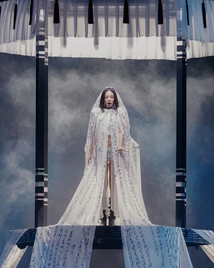 開場曲〈Seoul City〉一響起,Jennie 披上印有韓文記錄的最早的歌詞集《青丘永言》的 15 公尺長薄紗自天而降,象徵她正面對自己的起源與身份。當薄紗被揭開、韓文字在舞台上亮起的那一刻,那不只是符號,而是最先呼喚她名字的語言,也是最清楚、最直接告訴所有人——她來自哪裡的印記。
