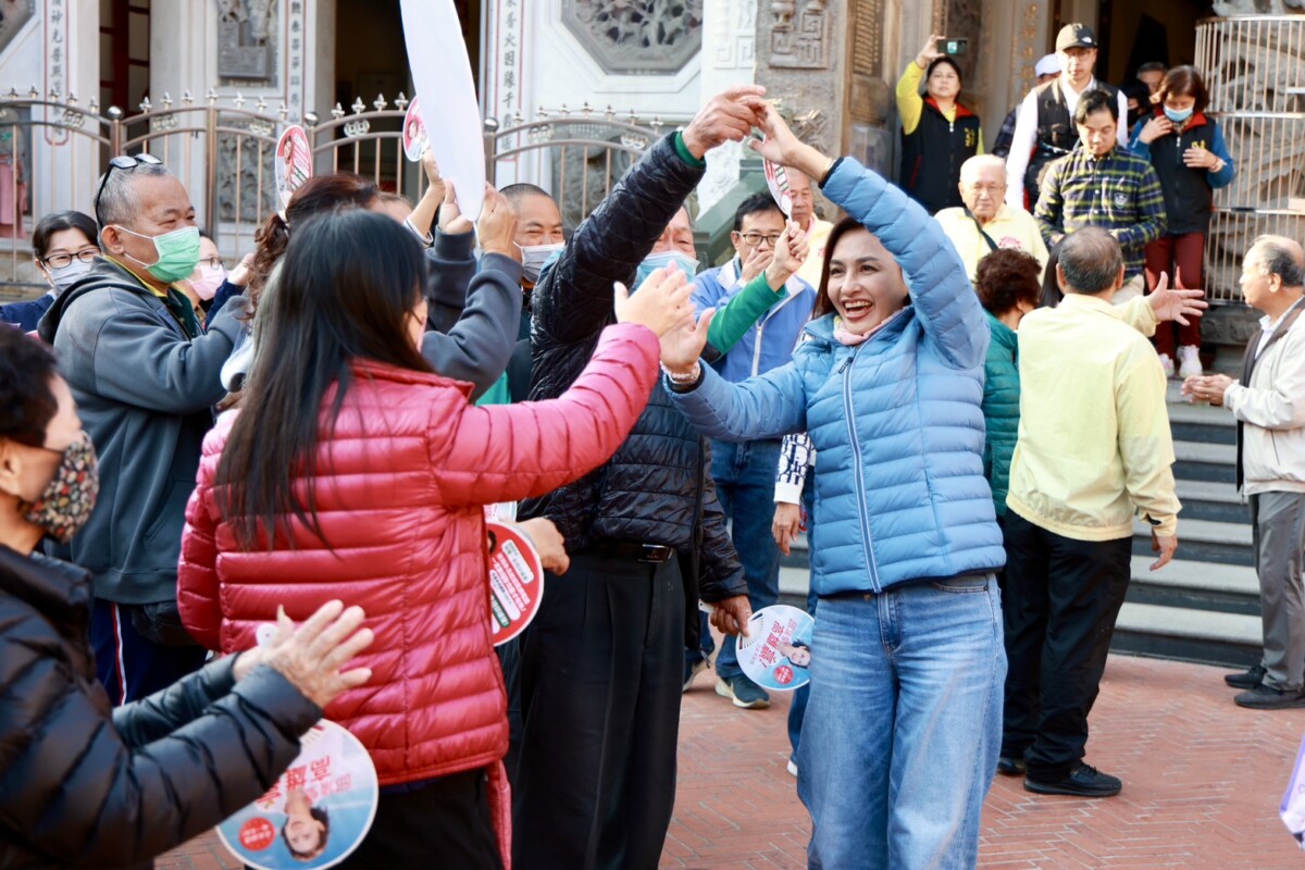 邱議瑩一早從「本命區」美濃出發,下午3點半車隊抵達鼓山、鹽埕,並與黃捷在哈瑪星代天宮會合。車隊一到場,現場民眾高喊「邱議瑩凍蒜!」,不僅揮手歡呼,更主動上前擁抱打氣,哈瑪星協會理事長也到場力挺,氣氛熱絡。