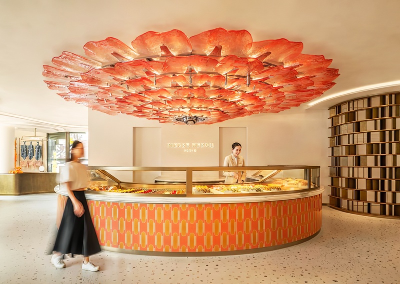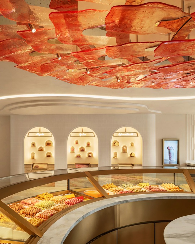 室內仿佛置身於甜點的柔軟內餡。溫潤的木色奠定沉靜基調,好比剛出爐的酥皮。店舖中央,一盞由數十片橘紅色玻璃花瓣組成的巨型吊燈,宛若盛放的熱帶花朵,亦似由糖片堆疊而成,投射溫柔光暈,成為空間的熱烈核心。下方圓形中島以馬卡龍幾何語彙呈現,展示品牌最具代表性的甜點。