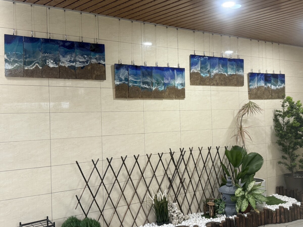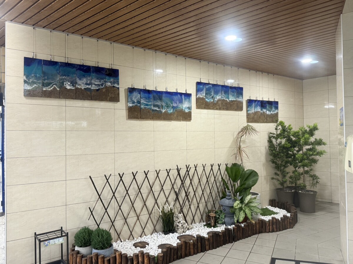 環保局說明,此次展出的作品以「沙灘、海洋、海岸線」為主題,象徵臺東自然景觀的交會與生命流動。由學生以木板為創作底材,結合環氧樹脂與顏料技法,呈現海洋律動與光影層次,使視覺效果更具深度與延展性。特別感謝臺灣中油初鹿站蘇靖惠站長支持此次合作,不僅協助作品裝設,也承諾後續維護,讓加油站公廁化身為旅客停留的溫暖空間。這項計畫讓孩子們的創作走出教室,實際服務人群,不僅增添了環境的友善度,更讓每一位造訪的旅人都能感受臺東獨有的熱情與創意。讓藝術成為提升公廁友善度與整體品質的重要元素。