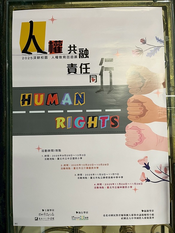 【記者 陳姿穎/台北 報導】由臺北市文化局與台北二二八紀念館主辦,財團法人台北市228協會提案,臺北市國民教育輔導團人權教育議題輔導小組及中華國際人權促進會協辦的「深耕校園人權教育巡迴展」,圓滿完成為期 3 個月的年度巡迴行程。本次展覽先後走入多所國小、國中及高中校園,透過貼近學生生活經驗的展覽與互動引導,帶領青少年認識人權價值,學習在日常生活中實踐尊重與包容。