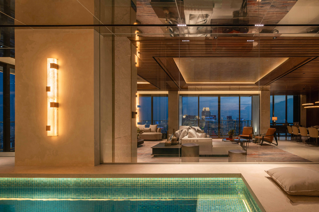 電梯大堂前方的自動玻璃門後是一座約6坪的空中泳池。泳池上方的鏡面天花設計,將水光、日光與雅加達天際線融為一體,構築出無限延伸的視覺效果。夜幕低垂,城市燈火在水面閃爍,詩意地演繹雲端生活的浪漫與奢華。