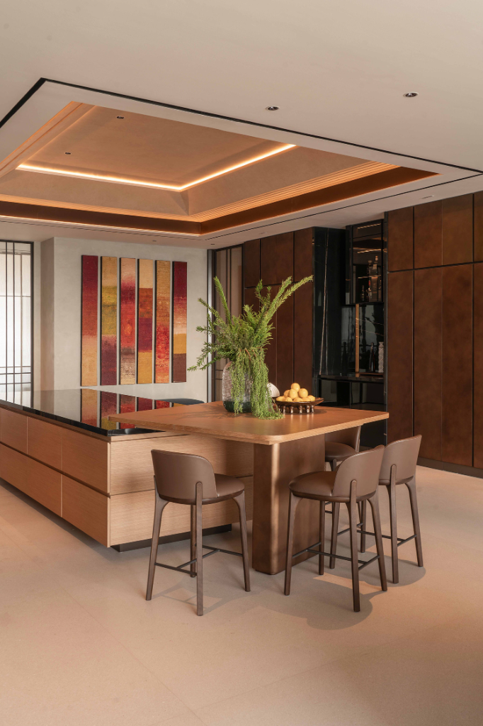 相鄰的開放式飯廳以暖金色調和富藝術感的牆面點綴,設計兼具實用性,並融入對家庭傳承的敬意。這裡是年輕一代招待親友的理想聚會場所,為每一次餐飲與歡笑締造珍貴回憶。