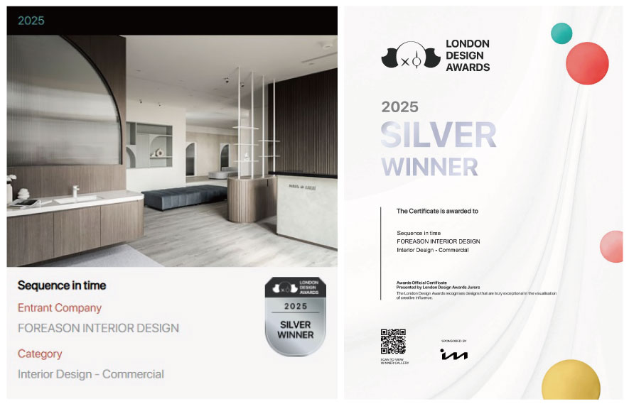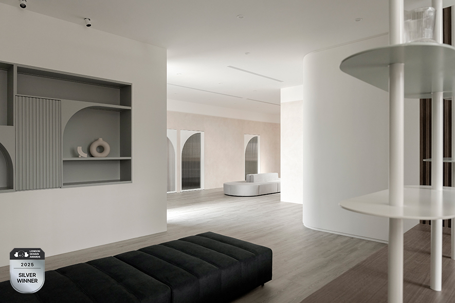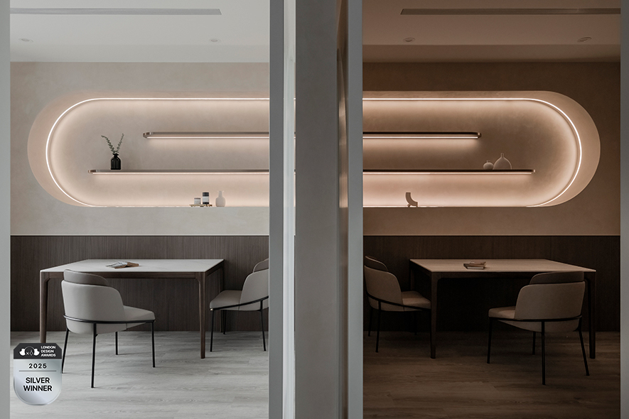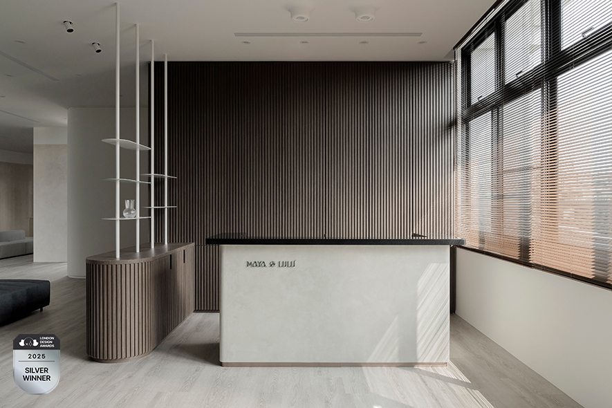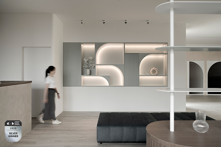 擎森設計 設計總監 陳楚扉 依循商空提供孕婦及嬰兒為主的攝影服務,運用大量曲線元素勾勒母體孕育嬰孩的形象,佐搭天然的白、木、灰色調,奠下溫潤而純樸的和暖基底,更象徵母親期待新生命到來的美好願景;滿盈溫馨意象的《時序》參與2025 LONDON Design Awards,以其打破一般攝影場所印象的柔煦創新設計,充分發揮該獎項注重的「跳脫框架」精神,一舉奪得本屆賽事的「銀獎」榮耀!