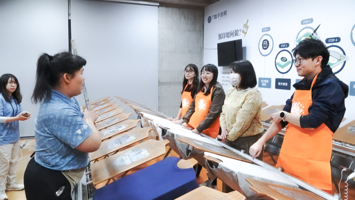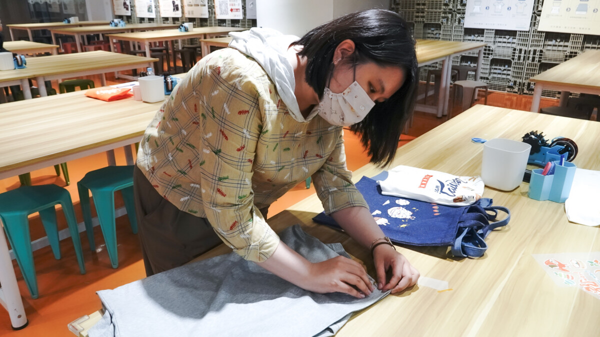 ▲參與「大港青年實習媒合計畫」的郭姓實習生(右二),引導青年局團隊示範手作T-shirt流程。