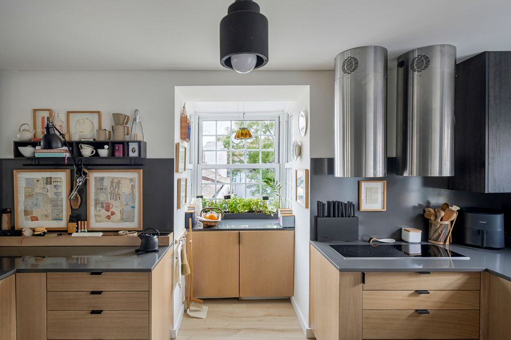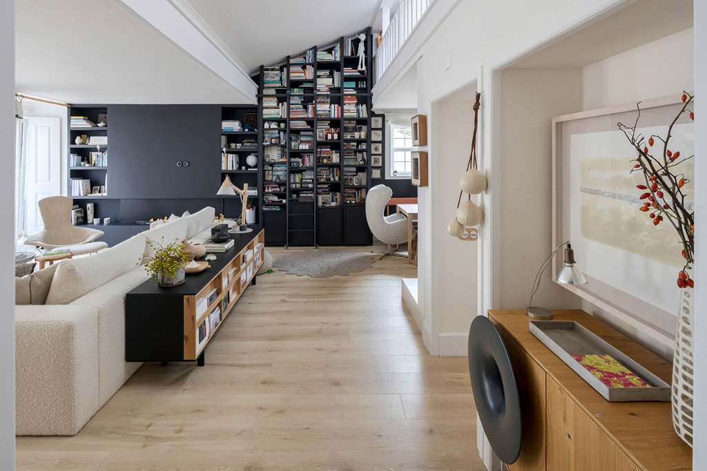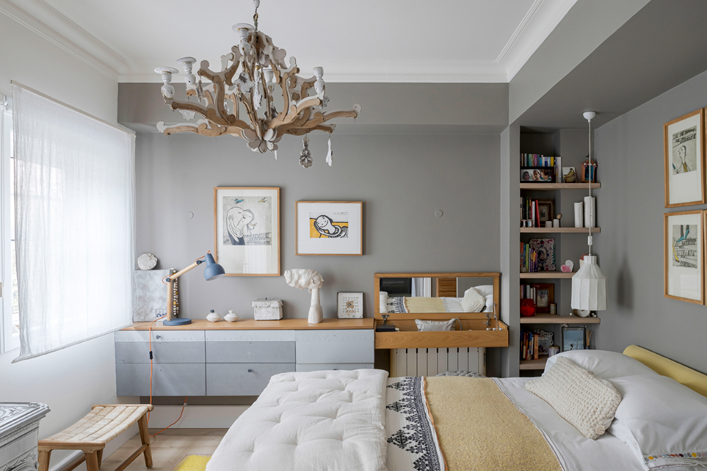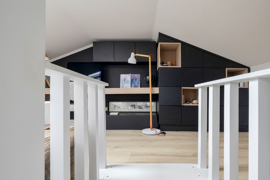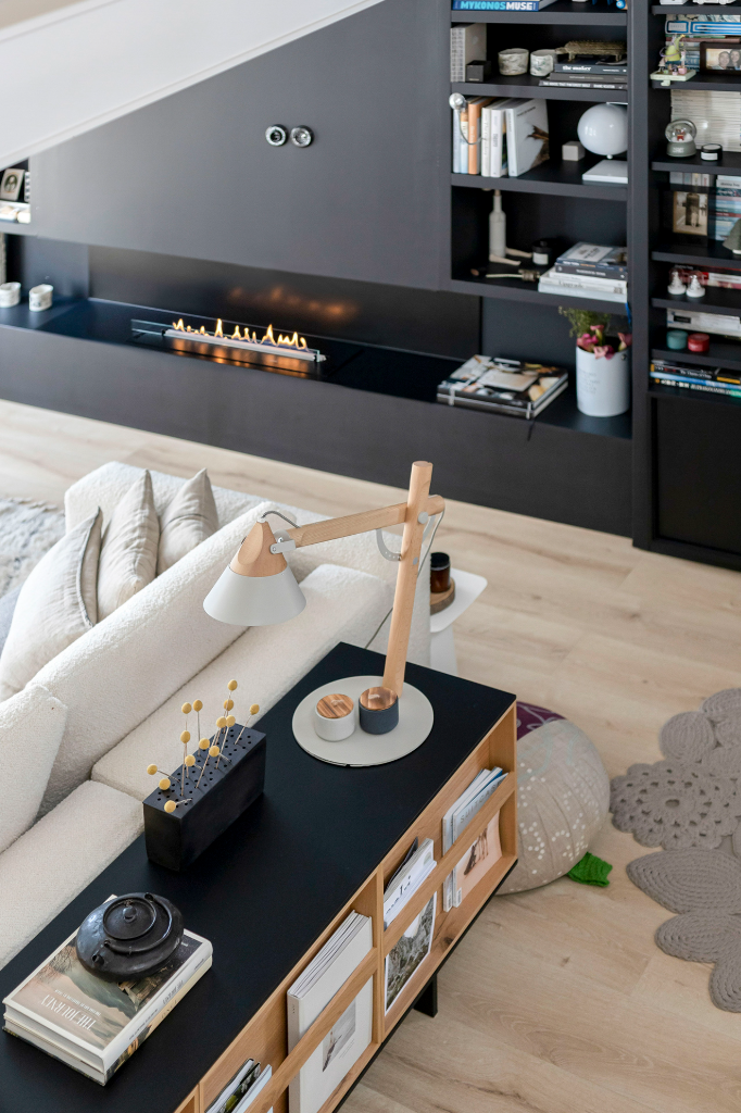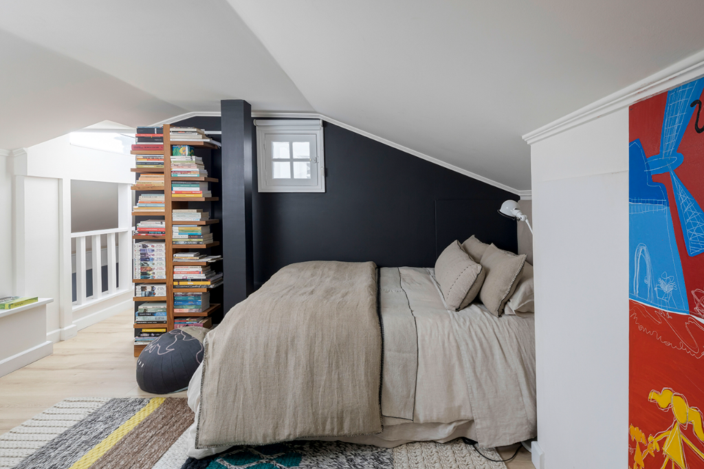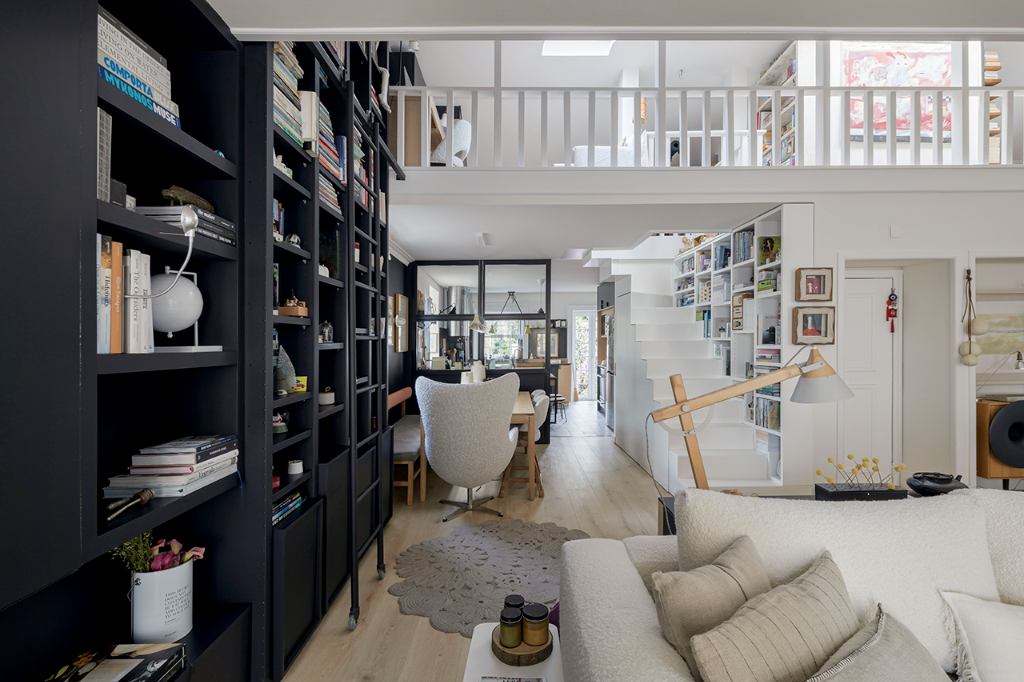 最初階段,房子有許多色彩,之後那些色彩被柔和的白色與木色所取代,賦予了本案極具北歐風格的外觀,再後來,白色與木色又被灰色給取代,連地板都更換為堅實的橡木,加上考量基地擁有充足的自然光,於是運用了黑色語彙,像是屋內有一堵長達8米的牆就漆成黑色,這是屋主在20多年前所不曾想像過的大膽嘗試。另一方面,住家還擺放很多訂製家具,比如充分利用了公領域的挑高,帶有梯子的深色大型金屬書櫃,或是在4米長的實木儲物櫃下方配置實木長凳,乃至從紐約骨董商處獲得的古老地毯、來自摩洛哥的傳統手織毯,甚至是由峇里島、東帝汶、中國遠渡重洋到來的裝飾品…等,在在都替公寓增添了一抹浪漫與獨特的人文氣息。