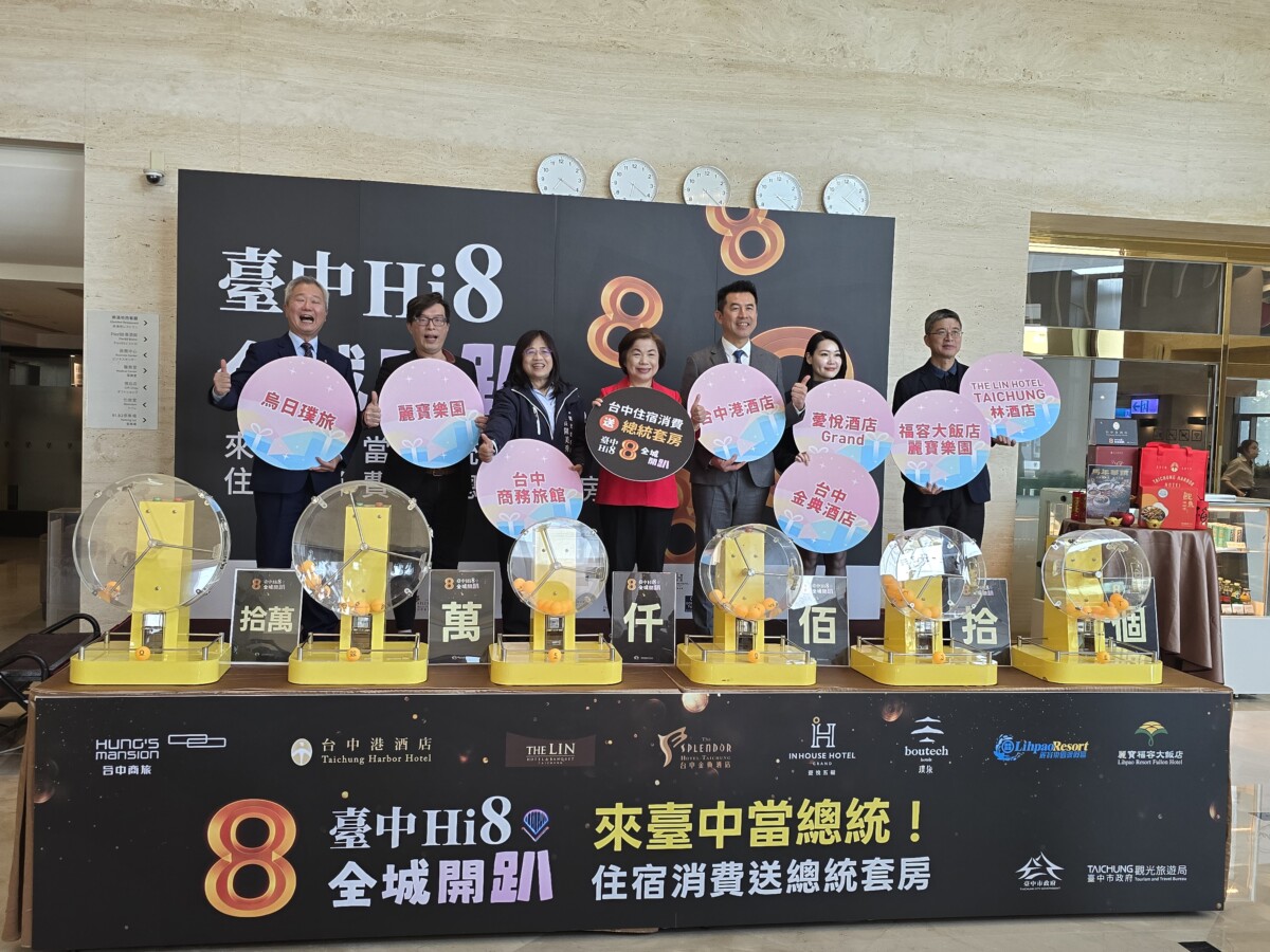 【記者 廖美雅/台中 報導】台中市政府觀光旅遊局推出「來台中當總統-住宿消費送總統套房」活動,自去(114)年12月26日開跑以來截至昨日已累積超過16萬張抽獎券,顯示民眾參與踴躍、活動成效顯著。觀旅局今(8)日舉行首波抽獎,抽出2位幸運得主,獲得台中港酒店總統套房住宿券。首波抽獎活動由觀旅局長陳美秀、台中港酒店總經理姜文偉、立委楊瓊瓔、台中市海線觀光發展協會理事長巫兆文,以及多家旅宿業者代表共同抽出幸運得主。