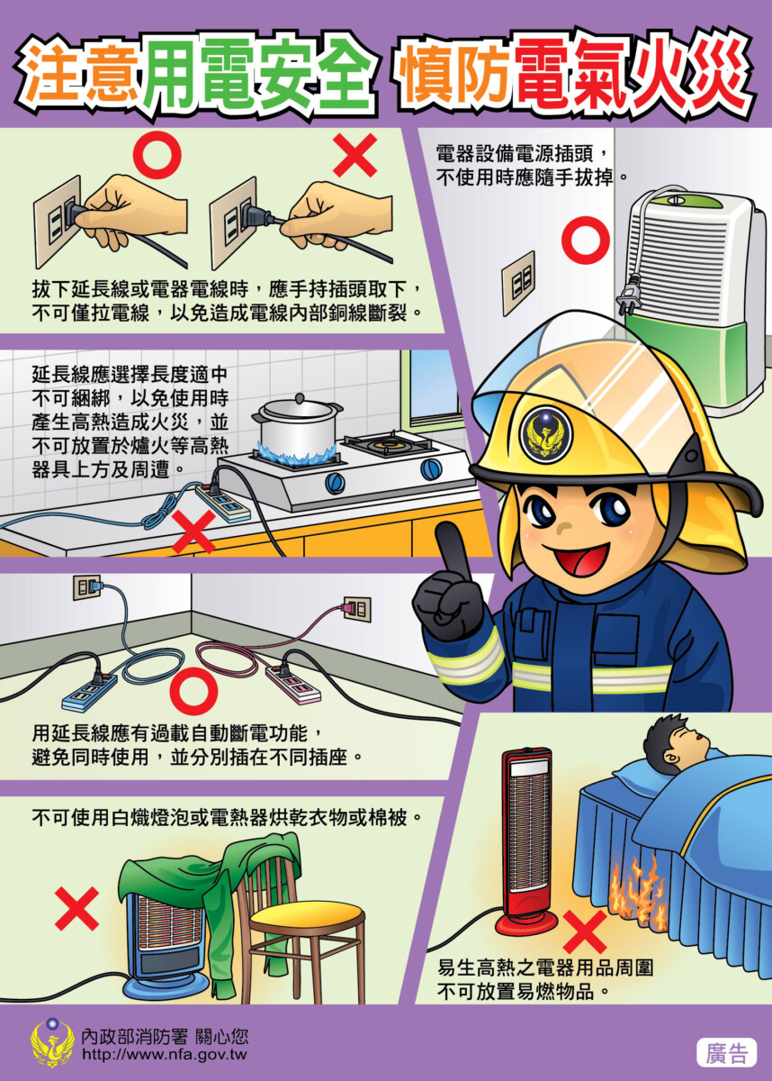消防局指出,依歷年火災統計分析,電氣火災多與電線老舊、電器設備長時間運轉造成過載、延長線或插座使用不當,以及電器產品老化或故障等因素有關。消防局呼籲民眾,應定期檢查臥室、客廳等區域之插座、延長線及各項電器設備,建議每三至六個月巡視一次,留意是否出現焦黑、鬆動、異味或異常發熱等情形;同時避免多項高功率電器共用同一插座或延長線,使用延長線時應注意其額定電流,並優先選購具有 CNS 安全認證及過載保護裝置的合格產品。