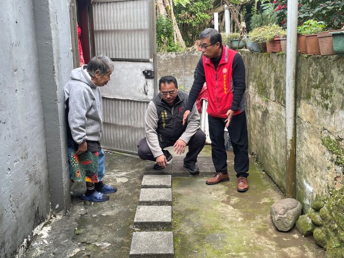 當天關懷訪視對象的郭阿姨居住在三芝偏遠地區,膝蓋退化致行動較慢,因門口走道顛簸容易跌倒,新北榮媒合中華熱心發展協會一同前往探視,並現場評估走道鋪整,致贈營養品慰問,關心其身體狀況。郭阿姨見到李副處長及王副秘書長一行人前來關心,內心充滿感激,也感受到社會的溫暖。