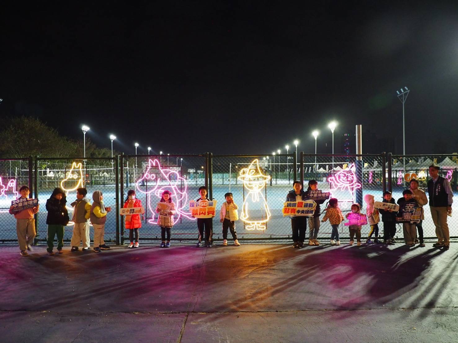 游局長指出,「姆明(Moomin)愛運動」以跑步、跳舞、划船、滑雪等運動情境為主軸,搭配互動燈光,讓市民在賞燈、拍照的同時,自然走進運動場域,體驗「運動生活化」的城市氛圍。感謝台中藍鯨運動熱區足球班的小球員,從2歲到10歲踴躍參加,也感謝家長熱情出動,一起在中央球場點亮運動的「幸福蜜馬」。另外,游局長也提醒,燈會期間(2 月 15 日至 3 月 3 日),民眾於中央公園賞燈之餘,也可前往中央球場與姆明合影,按下「GO」鍵啟動互動燈光。