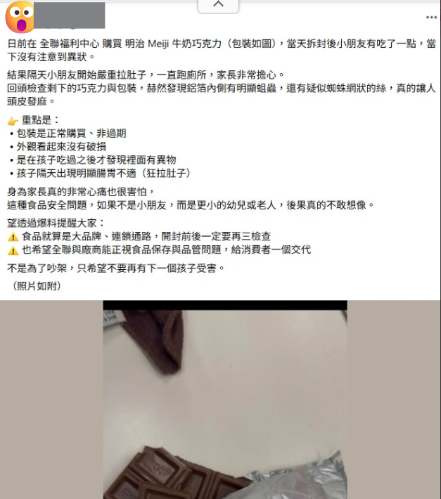 【Lai傳媒、記者爆料網/林千允/綜合報導】食品安全再度引發家長憂心。有民眾爆料,日前在全聯福利中心購買一款明治牛奶巧克力,包裝完整、效期正常,未料拆封後竟在鋁箔包裝內側發現蛆蟲與疑似蜘蛛網狀的絲狀物,畫面令人頭皮發麻。