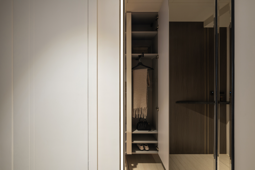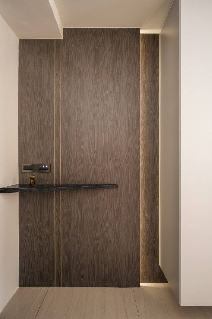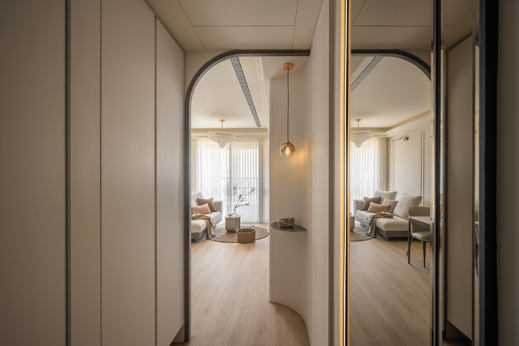 玄關地坪以拋光石英磚界定出入分隔,並與延伸至室內的木地板自然銜接,形成過渡層次。入口端景牆選用木皮包覆,燈條隱匿其間,光影下顯得溫潤深邃。中央處的三角石紋平台既是造型亮點,也提供置放小物機能;另側的白色懸空鞋櫃輕盈簡潔,對向則整合鏡面與收納櫃體,頂天立地的設計巧妙隱藏電箱,使觀感更顯俐落統一。順著廊道前行,弧形拱門巧妙破除傳統直線格局,搭配異材質鐵件端景平台與設計吊燈,形塑層層遞進的光影節奏:包含間接照明、鋁槽線燈與造型吊燈,為入門區域注入屬於家的專屬迎賓儀式感。