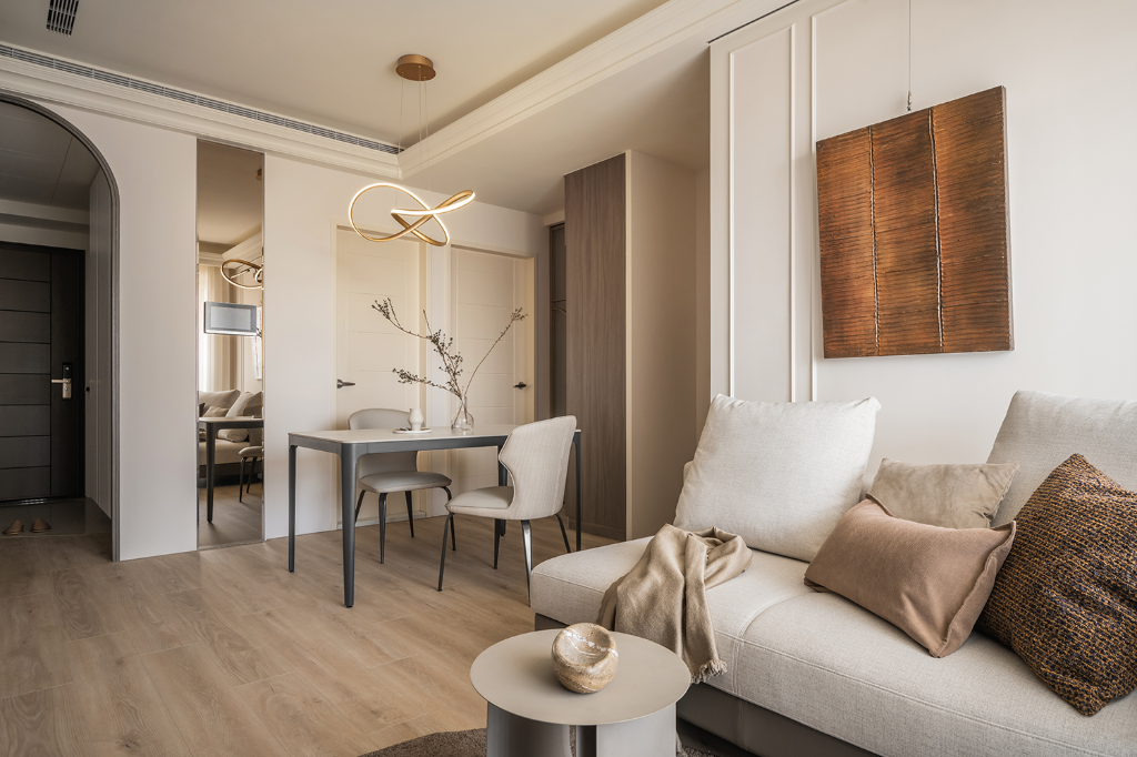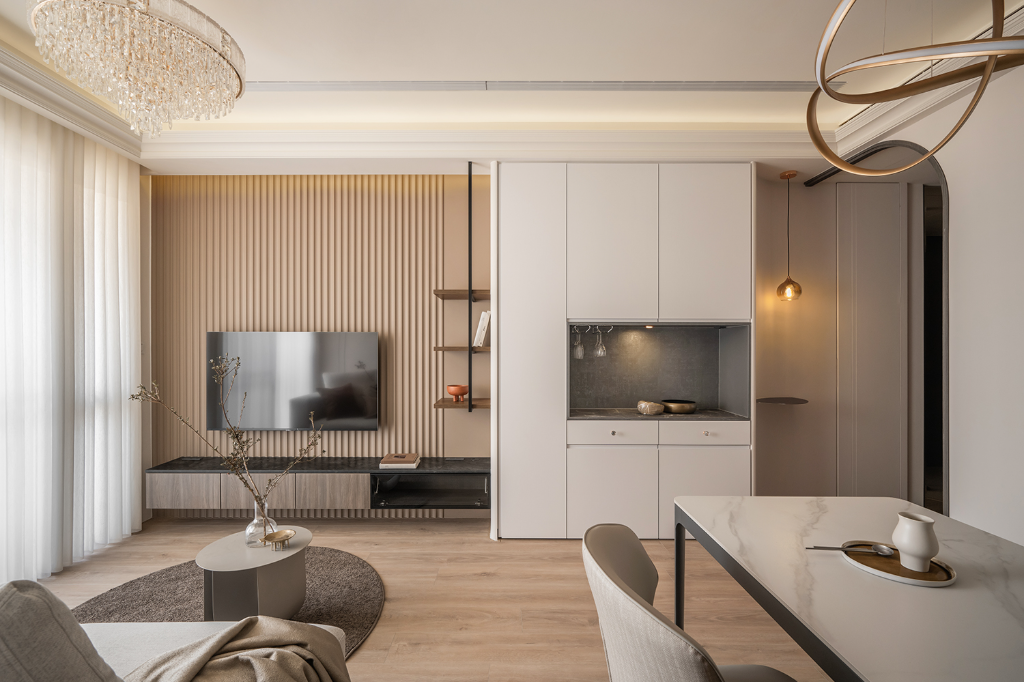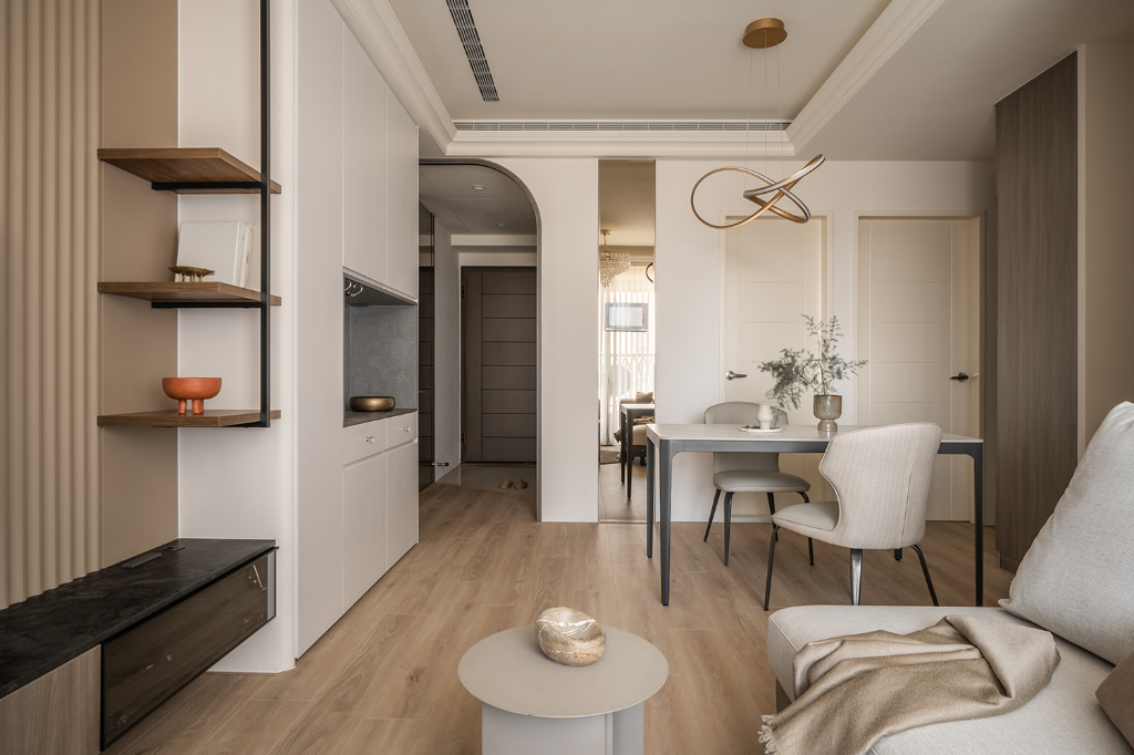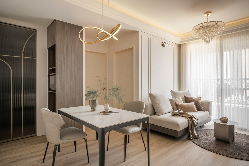 客廳整體以奶油色與中性色調鋪陳,搭配白紗簾引光入室,使空間溫潤舒展。沙發背牆以造型線板妝點,輔以水晶吊燈與壁燈,營造柔和中帶有微奢氣息。電視牆特別選用淺咖啡波浪系統板材,並透過開放層架與白色餐邊櫃相連,產生一氣呵成的視覺印象,圓形茶几與地毯則柔化空間線條,為居家日常增添從容自在的節奏感。特別值得一提的是,客廳與餐廳天花四周以線板修飾,中段則保留挑高,讓生活尺度得以延伸、呼吸感大幅提升,為小宅挹注一抹寬闊的輕盈氣息。