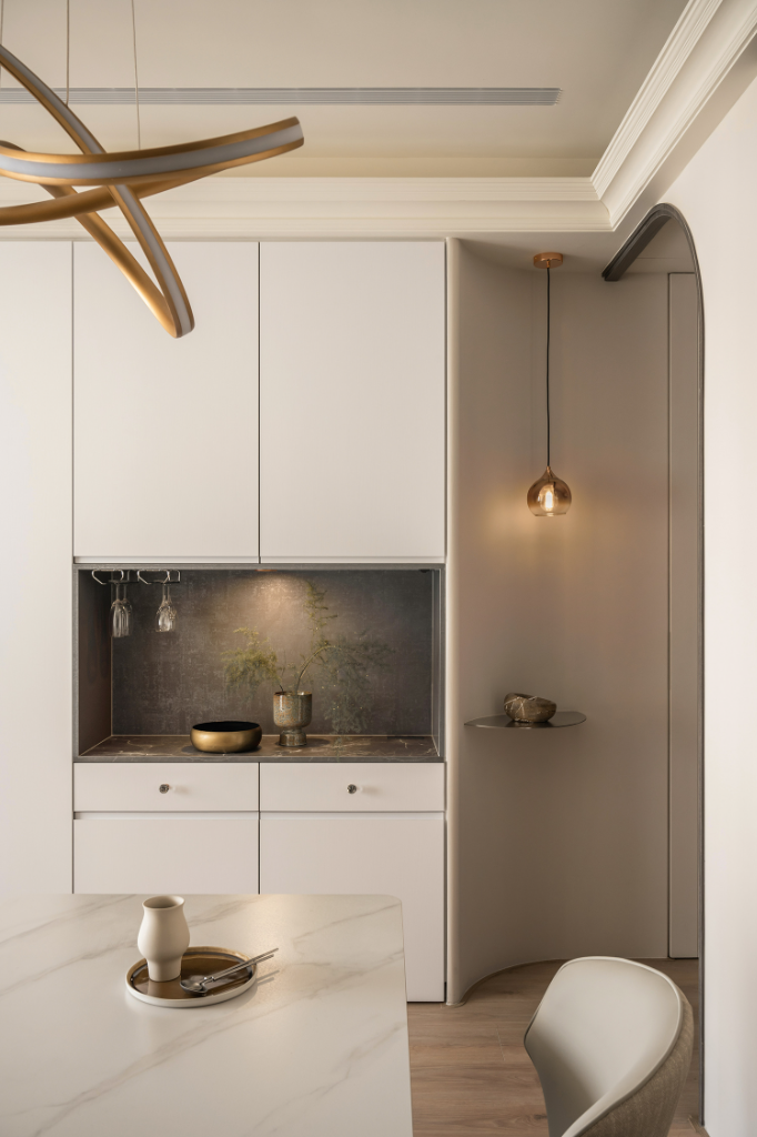 公領域強調開放式格局,餐廳與客廳相連,共築家的交流核心。餐桌選用石紋材質,搭配簡潔餐椅與金屬線型吊燈,構築清爽優雅的用餐環境。餐邊櫃右側巧妙延續弧形語彙,無縫串聯玄關與公區,使動線流暢自然。廚房則以長虹玻璃鑲嵌幾何鐵件門片,優雅詮釋不同場域角色,同時隔絕油煙,一旁電器櫃設置尤其方便屋主烹飪時更加順手。