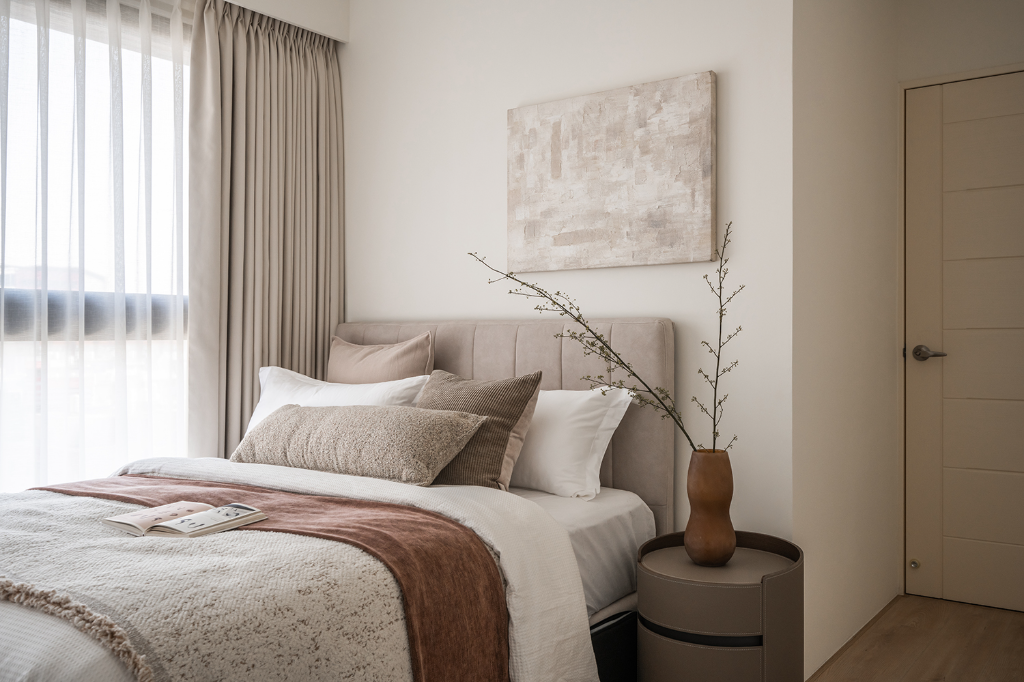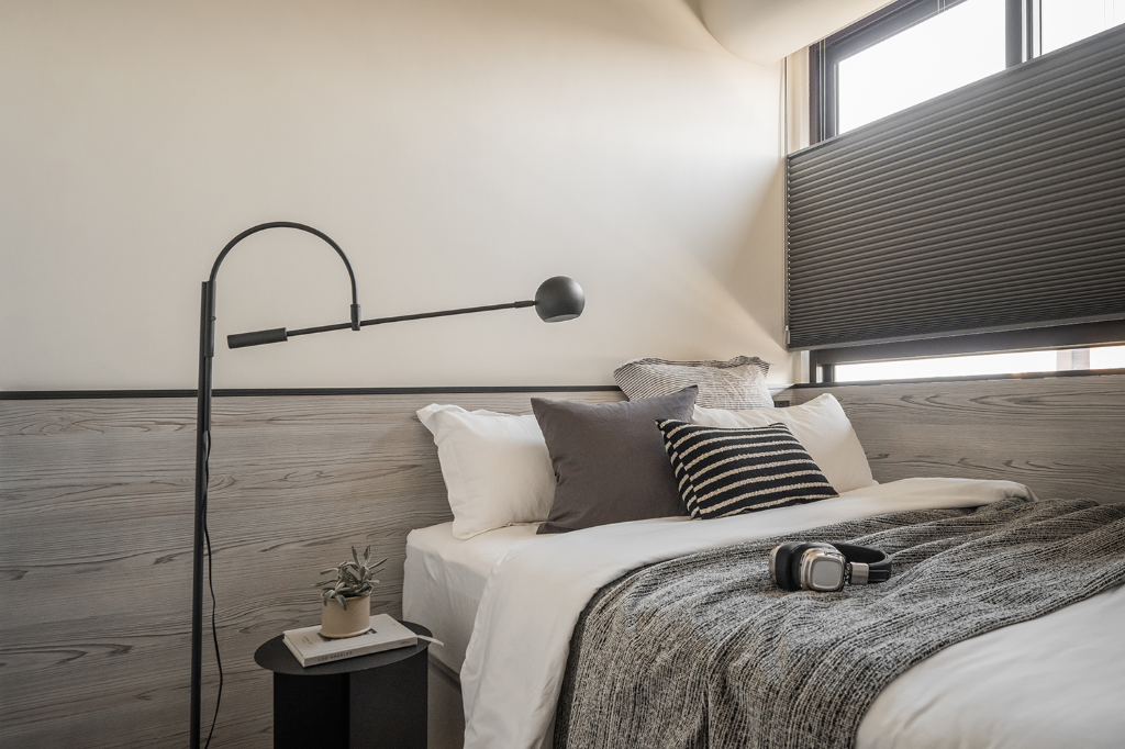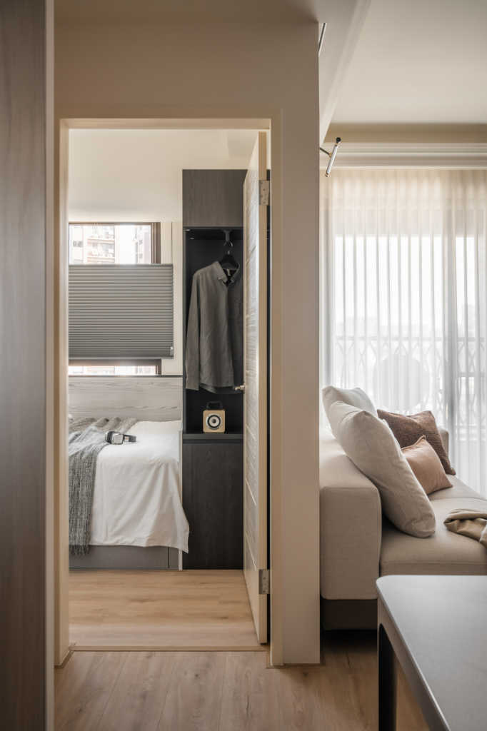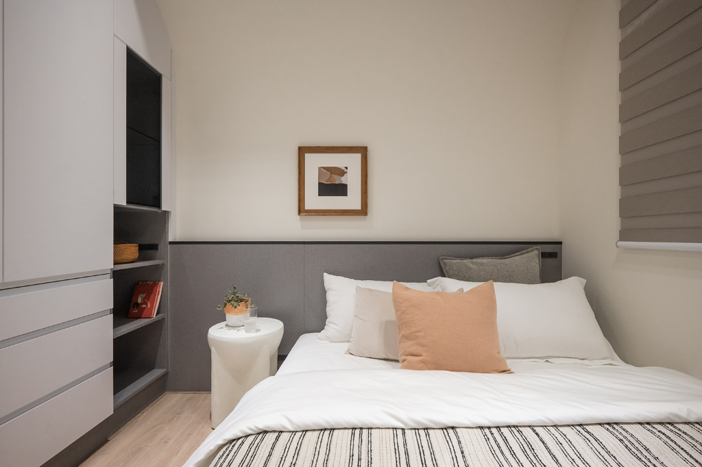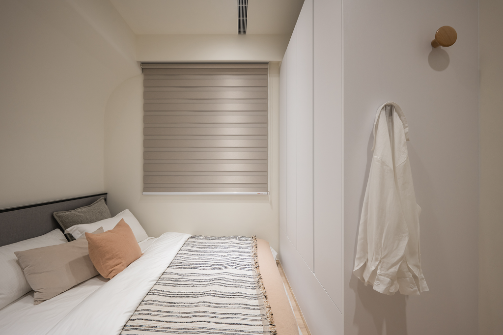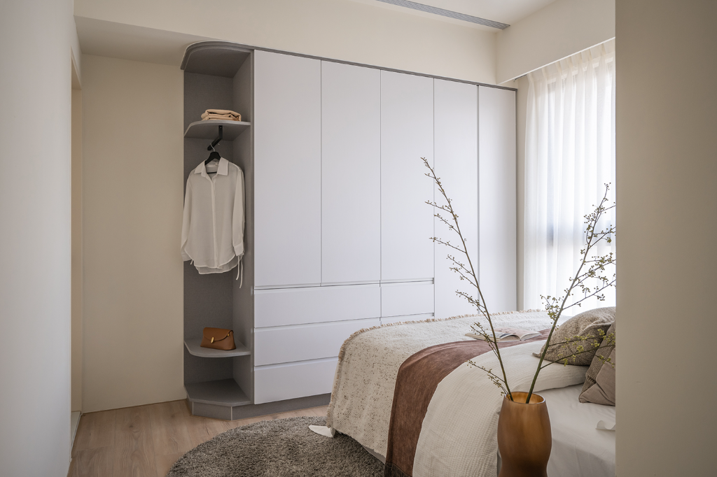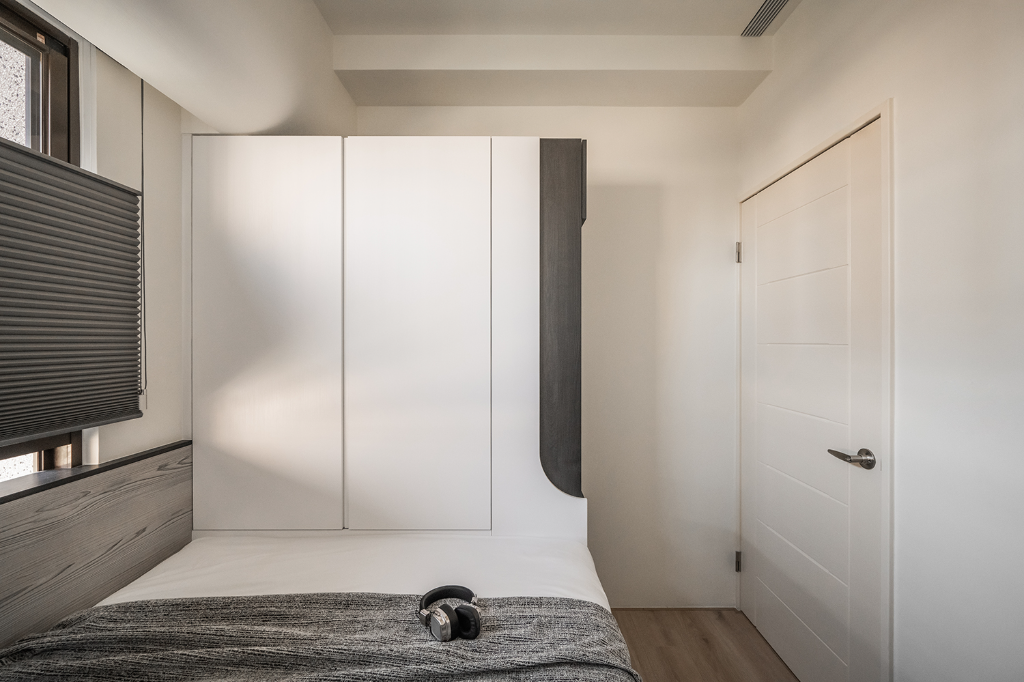 臥室空間則依照不同成員的特性量身訂製。主臥室以柔和奶茶色調搭配床頭繃布與弧形衣櫃,鋪陳靜謐沉穩的休憩氛圍。男孩房主打黑白灰色系,床頭與壁面以木紋系統板包覆,天花橫梁以圓弧修飾,消弭壓迫感同時提升使用舒適度。女孩房在灰白基底中注入暖橘色系與布紋色床頭板,加上完整收納安排,彰顯溫潤親和的女性氣質。雖空間有限,卻藉由細膩布局與色彩層次,讓每間臥室皆擁有獨一無二的情感溫度。