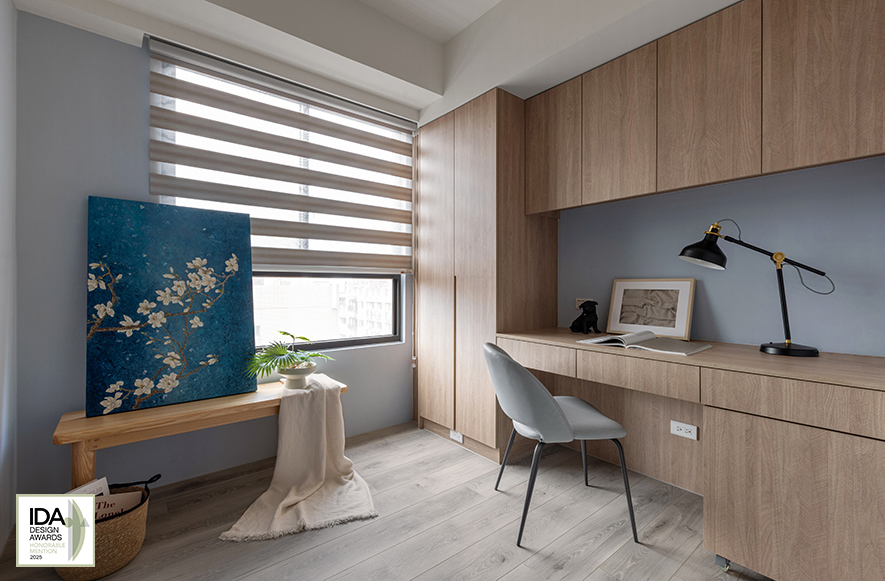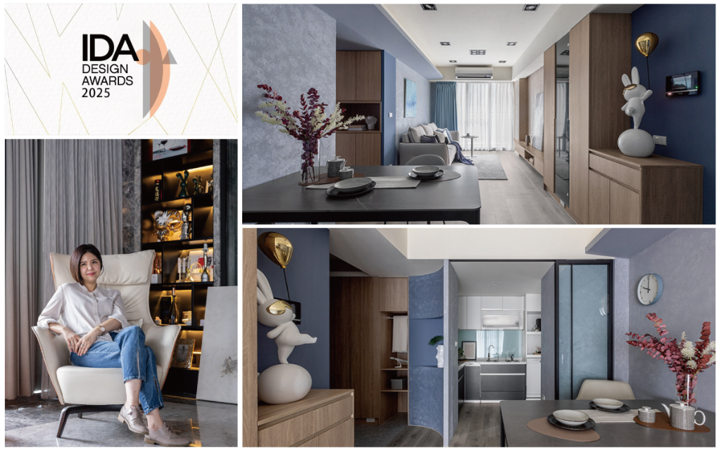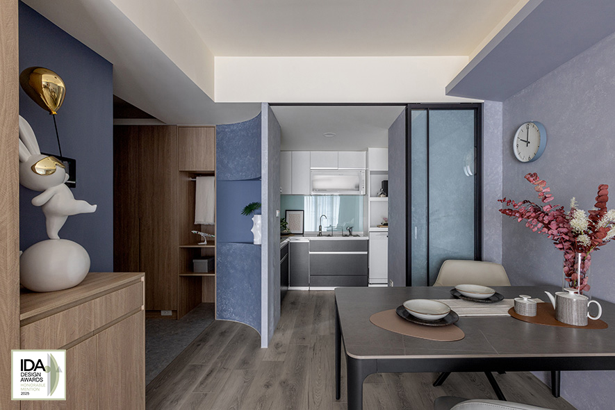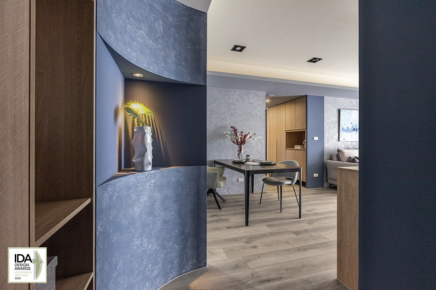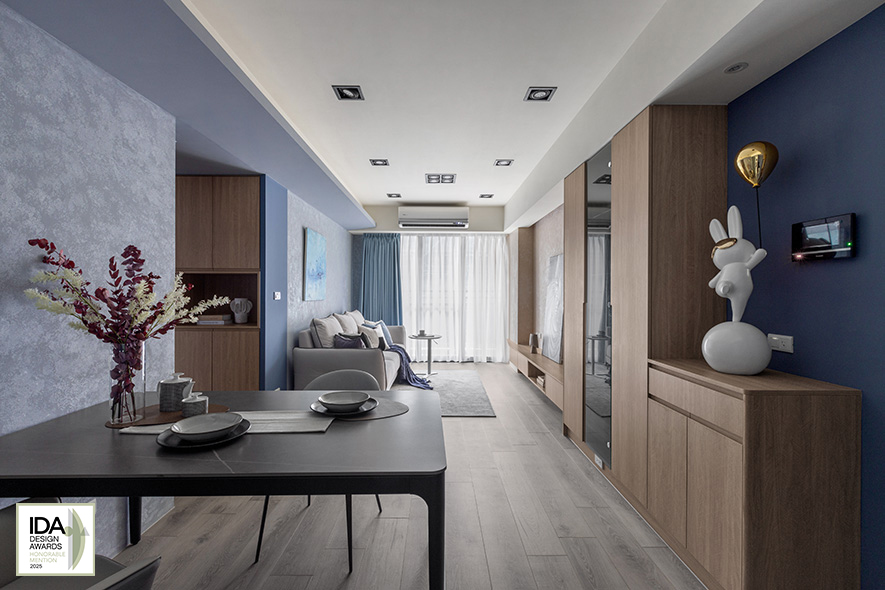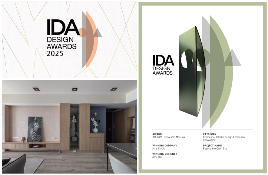美國IDA國際設計大獎自創新性、實用性和發展性等多種面向為評選標準,旨在發掘、表彰「設立新標準」與「突破室內設計界限」、「改變人們生活和工作空間」的優秀設計師及團隊。2025年度賽事中,艾美幸福設計 設計總監 許捷甯 攜住宅作品《光韻》角逐殊榮;其設計靈感汲取職業為機師的屋主工作日常——將在萬尺高空俯瞰的雲海與天光變幻,化為空間中層疊的藍調與灰白色彩;之中首度引入德國AURO藝術塗料,以手工複合技法於牆面塑造起伏質感,搭配暖木色系點綴其間,讓居者彷彿置身雲端,感受晨曦與暮色的自然流轉,高度契合此賽事多方理念,榮獲「Honorable