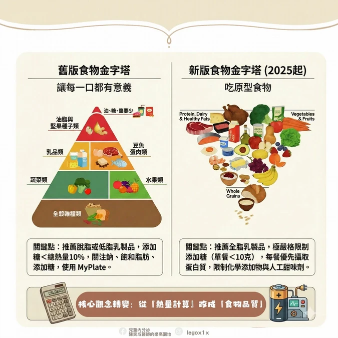 新版食物金字塔在核心觀念,則是換了一個更直白的中心思想——吃「原型食物」(Eat real food)。美國官方其實是在承認一件事,高度加工食品、人工添加物、精製糖才是造成肥胖、糖尿病與代謝問題的元兇。