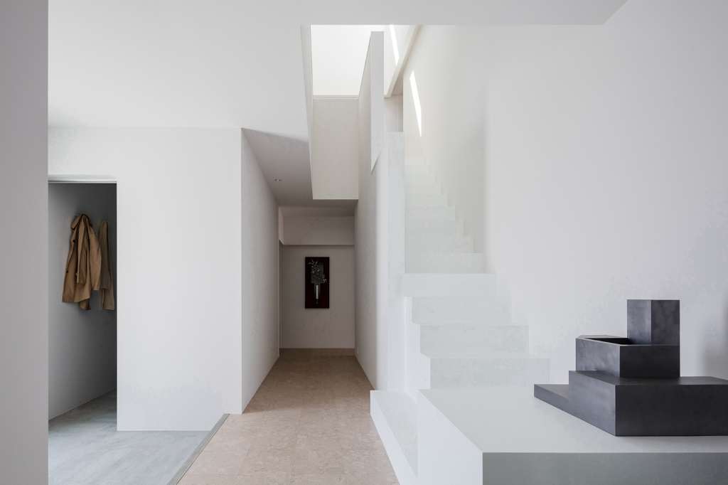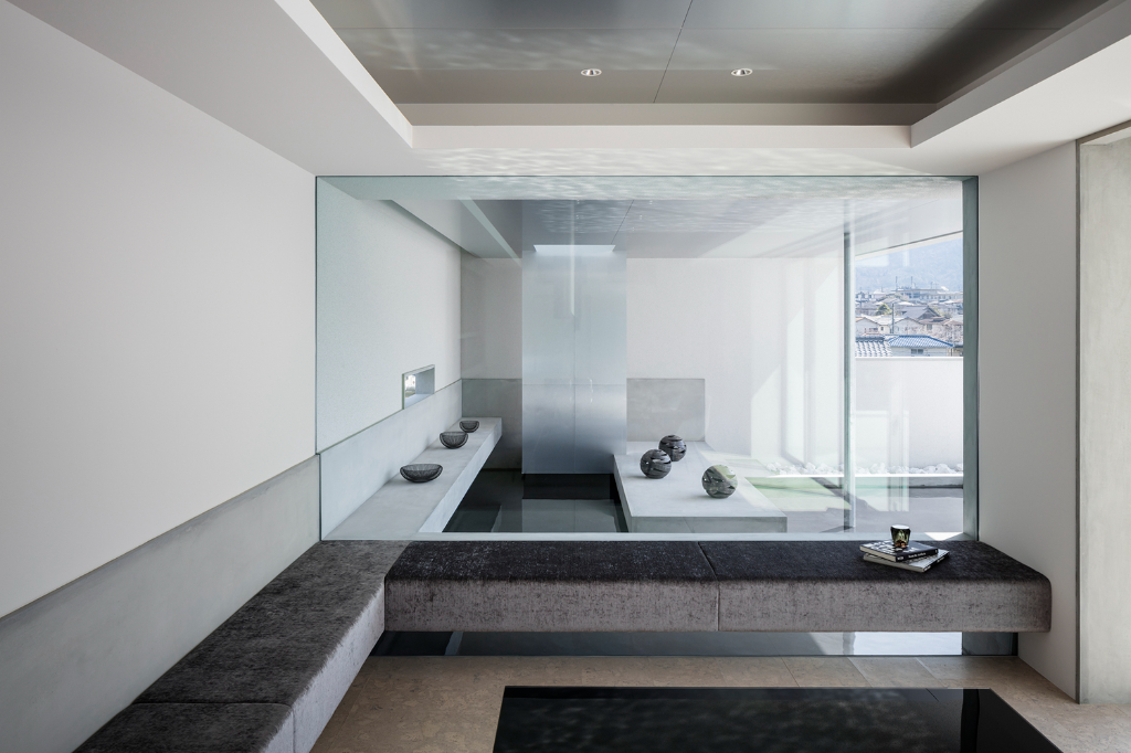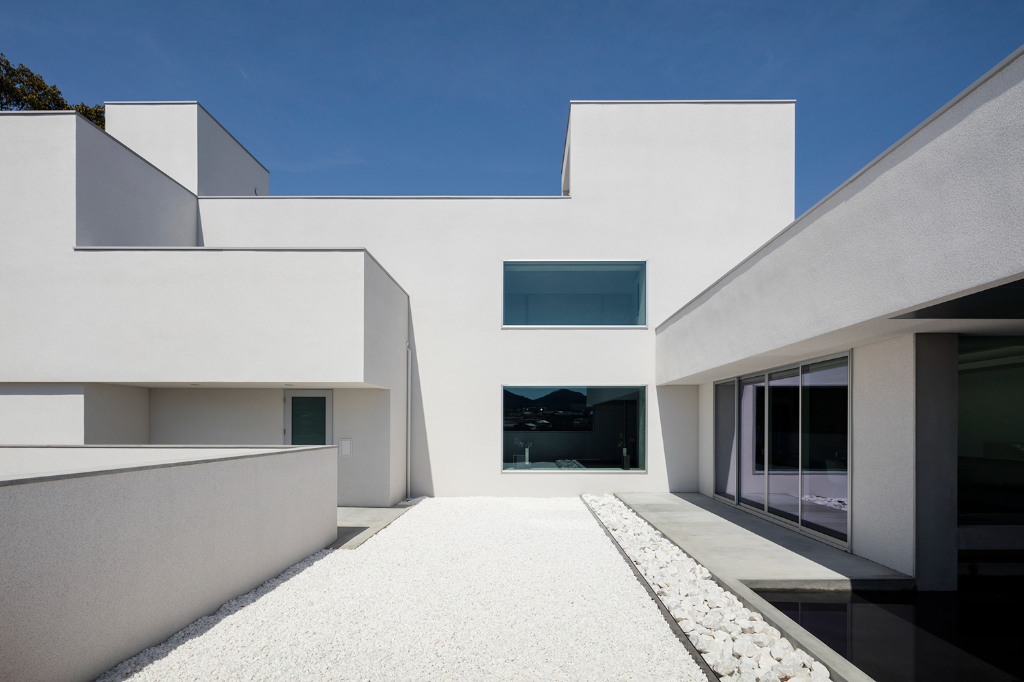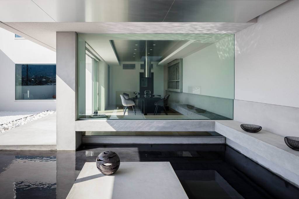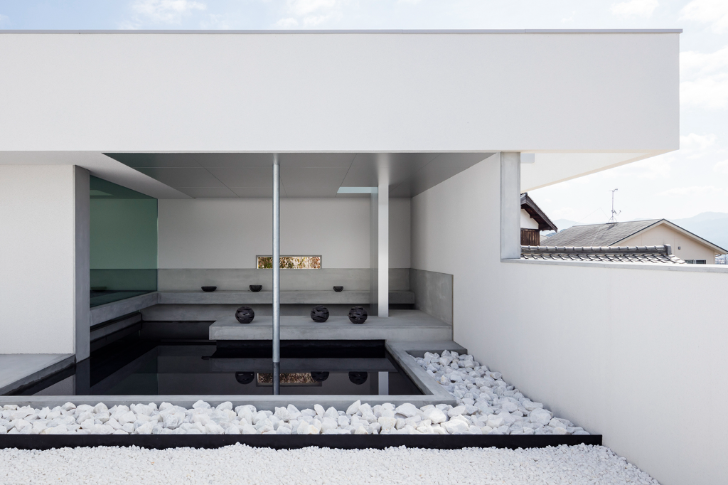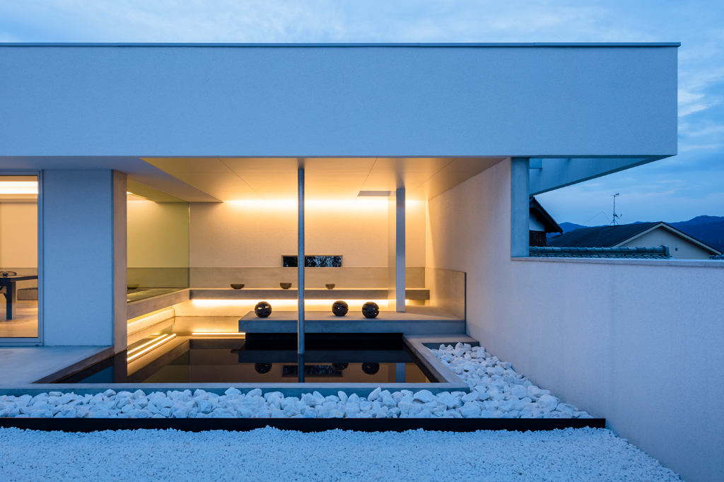 沒有植栽的碎石庭院被設計成一個白色空間,以純白背牆做襯托,形塑出彷彿向四面八方漣漪般擴散的靜謐感。為了打造非凡體驗,屋簷下的角落被設置成一個面向庭院的水池與一個房間,藉此在視覺上連結內部與外部,因為微風、下雨與空氣的流動,這安穩的一隅隨時會展現不同的景緻,猶如藝廊般不知不覺間替別墅添上一抹濃郁人文氣質。倒映在水池中的反射與擺放在這裡的藝品,無形中描繪出一幅精緻細膩的畫面,讓建物更增光彩。