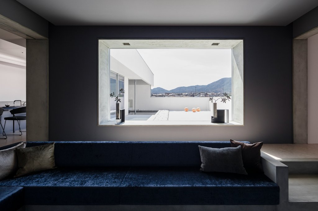 客戶在與設計師溝通時,要求在充分利用基地優勢的同時,更要於日常生活中創造出一種非凡的居住體驗。因此設計師規劃了一座面向山峰的四合院以達到借景的壯闊視覺效果,本案是由一個強調橫向結構的建築與圍繞庭院的牆壁所組成,牆壁的高度經過計算,讓人得以從房間內就可以毫無阻礙的看見對面的大山脊,簡約俐落又奇特突出的牆壁與建築融為一體,創造出美麗的天際線,使其成為嶄新風景的一部分,並進一步增添了該地區的迷人風貌。