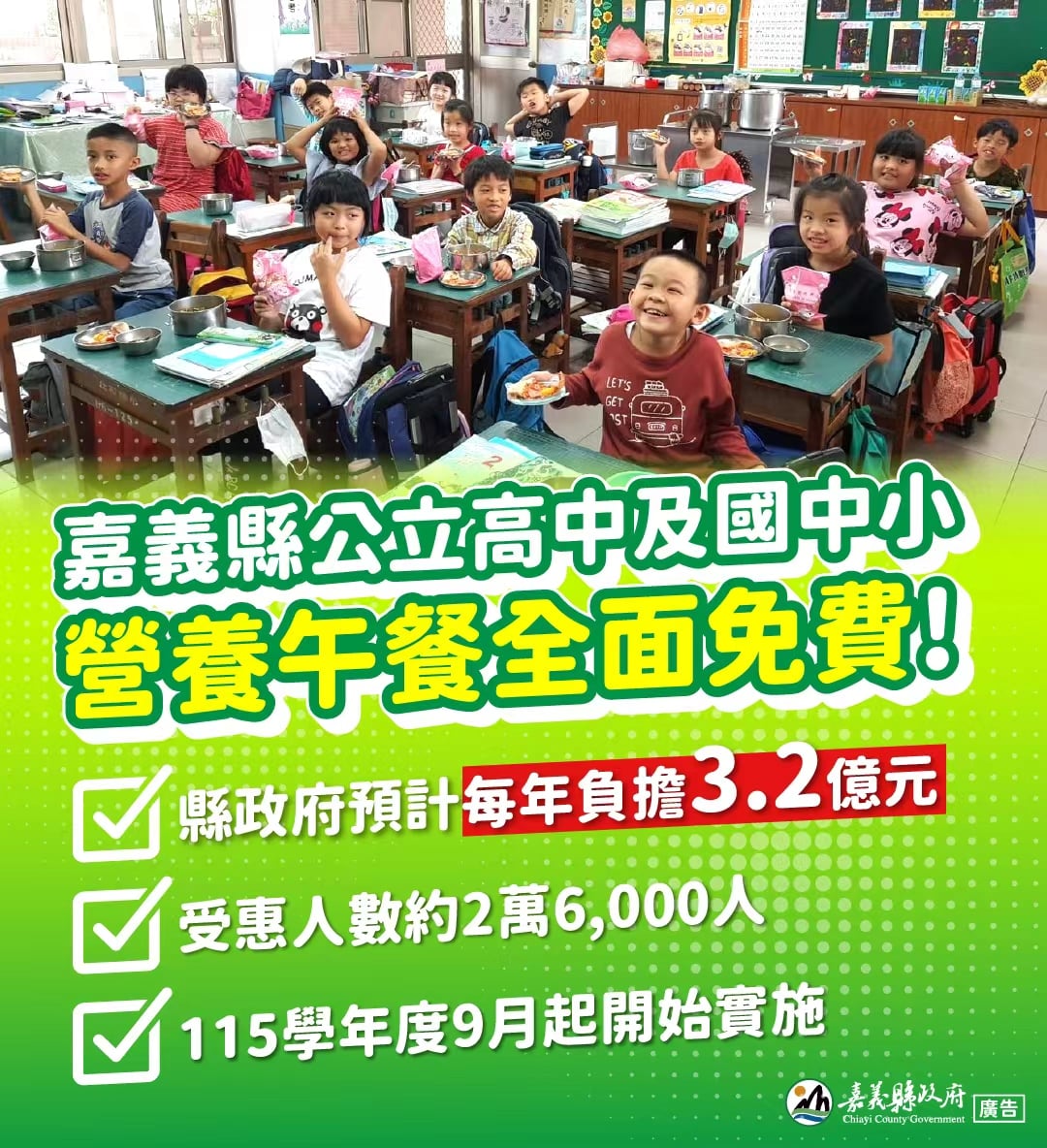 圖:嘉義縣政府宣布自115學年度(115年9月)起,全面實施所屬公立高中及國中小學生營養午餐免費政策,讓每一位孩子都能在校園中安心用餐、健康成長。(記者吳瑞興翻攝)