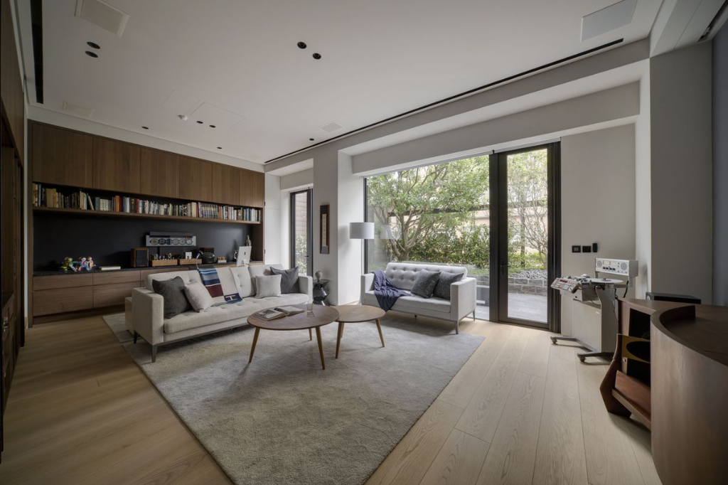 豪宅注重整體的裝潢美感,因此設計團隊在設計上下足功夫,追求極致聲學體驗,規劃上以「聆聽」、「接待」、「休憩」三軸佈局,包括自然光線最大化、材質的合適選擇與搭配、色彩的妥善運用、訂製家具與精美裝飾,打造出雋永迷人的專屬居住格調。